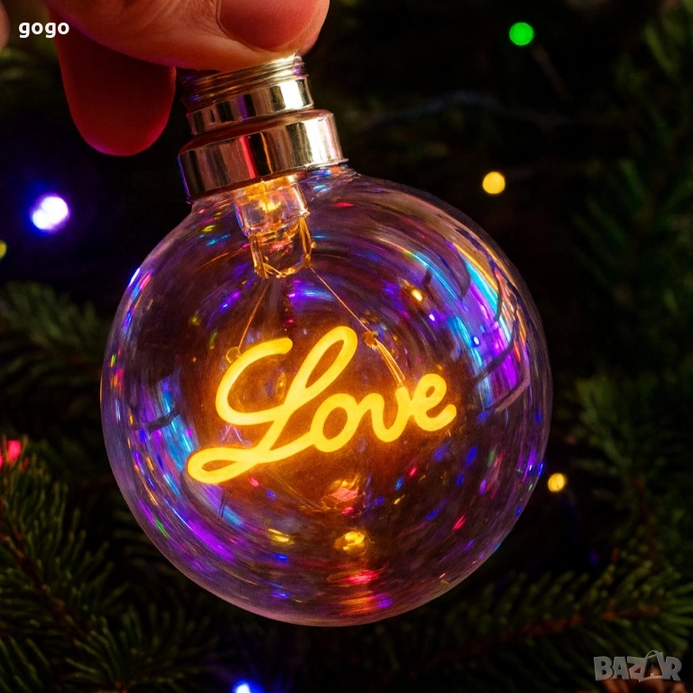 Коледна LED декоративна крушка с фигура – Елха / Love – Топъл празничен акцент за дома и подарък Варианти: Love: 30лв. 15.3382 евро Варианти: Елха: 26лв. 13.2931 евро Материали: прозрачна устойчива пластмаса и LED елемент; Размери: стандартен размер на декоративна крушка; Цветове / светлини: ярко LED осветяване с фигура (елха или Love); Безопасност: ниска консумация 3W, студена светлина, подходяща за деца; Фасунга: Е27 – поставяш за 2 секунди; Допълнителни елементи: вътрешна празнична форма; Подходящ за деца: да – без нагряване, без риск. елха - Е27,3w,A70 love - E27,3W,G95