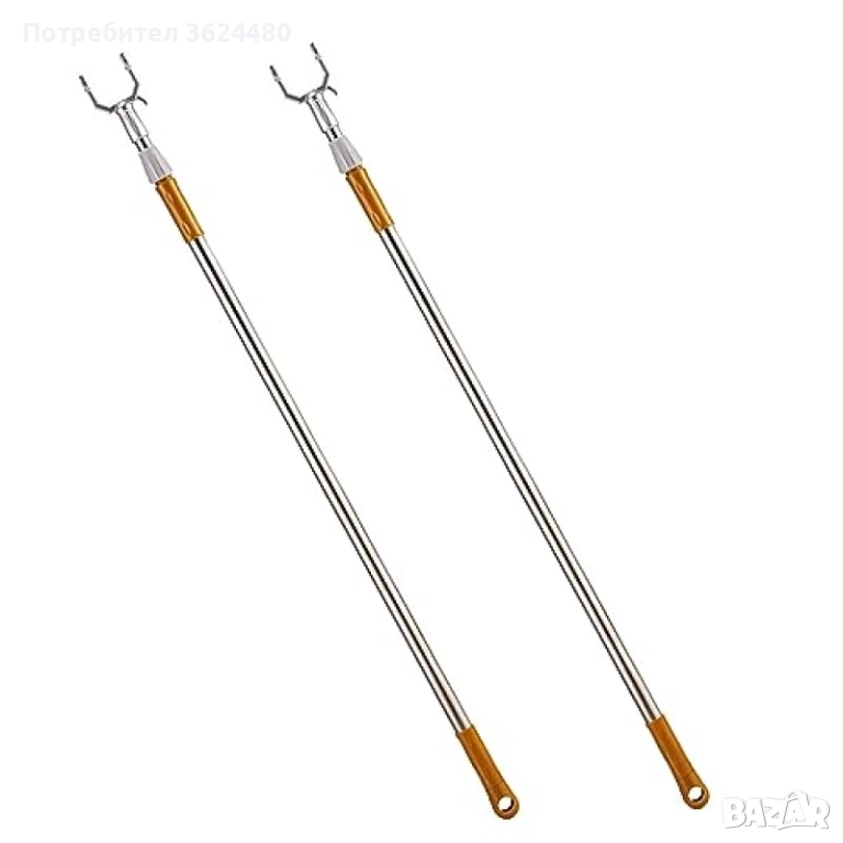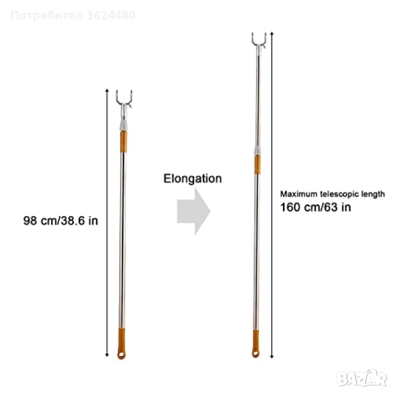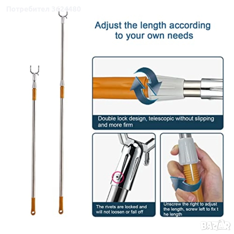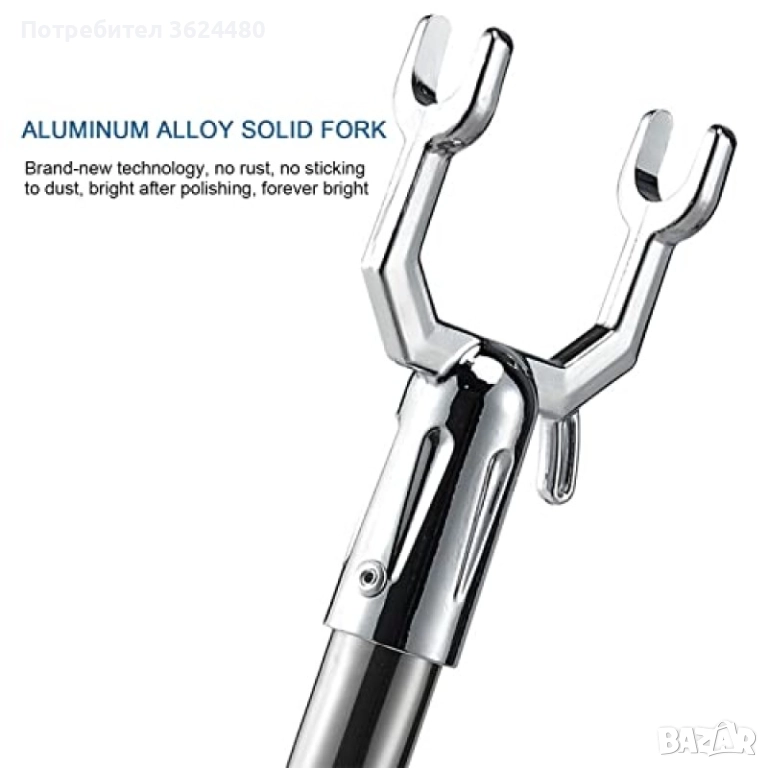Осигурете си лесен достъп до дрехите, закачени на високо, с тази телескопична пръчка за гардероб. Нейната основна функция е да улесни свалянето и закачането на дрехи на всяка височина, от 96 см до цели 160 см. Изработена е от неръждаема стомана и разполага с двойно заключване с винтов механизъм, което гарантира, че пръчката ще остане стабилна и без приплъзване при всяка настроена дължина. U-образната кука в края е специално проектирана за сигурно захващане на всяка закачалка или друг предмет.