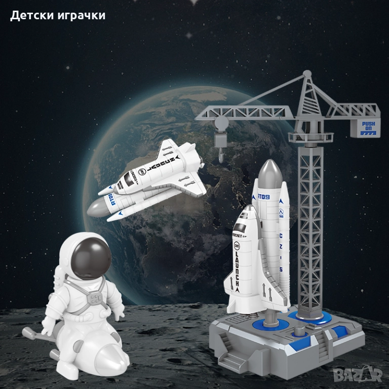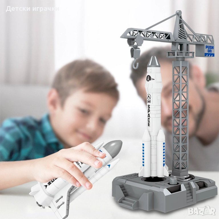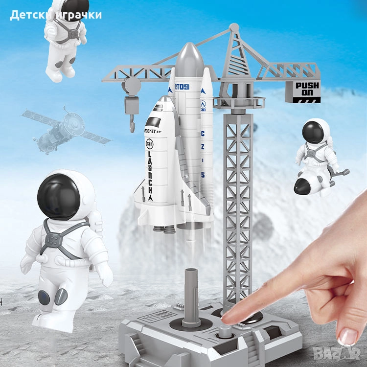 Децата могат да изстрелват два модела ракети един след друг от стартова площадка, оборудвана със зона за изстрелване и специален въртящ се кран.