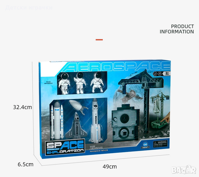 Комплектът включва и три фигурки на астронавти, едната от които може да се монтира на специален миниатюрен летящ апарат.