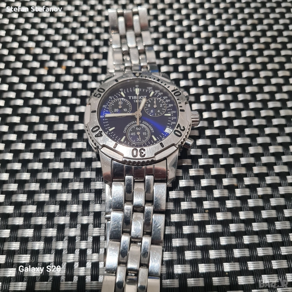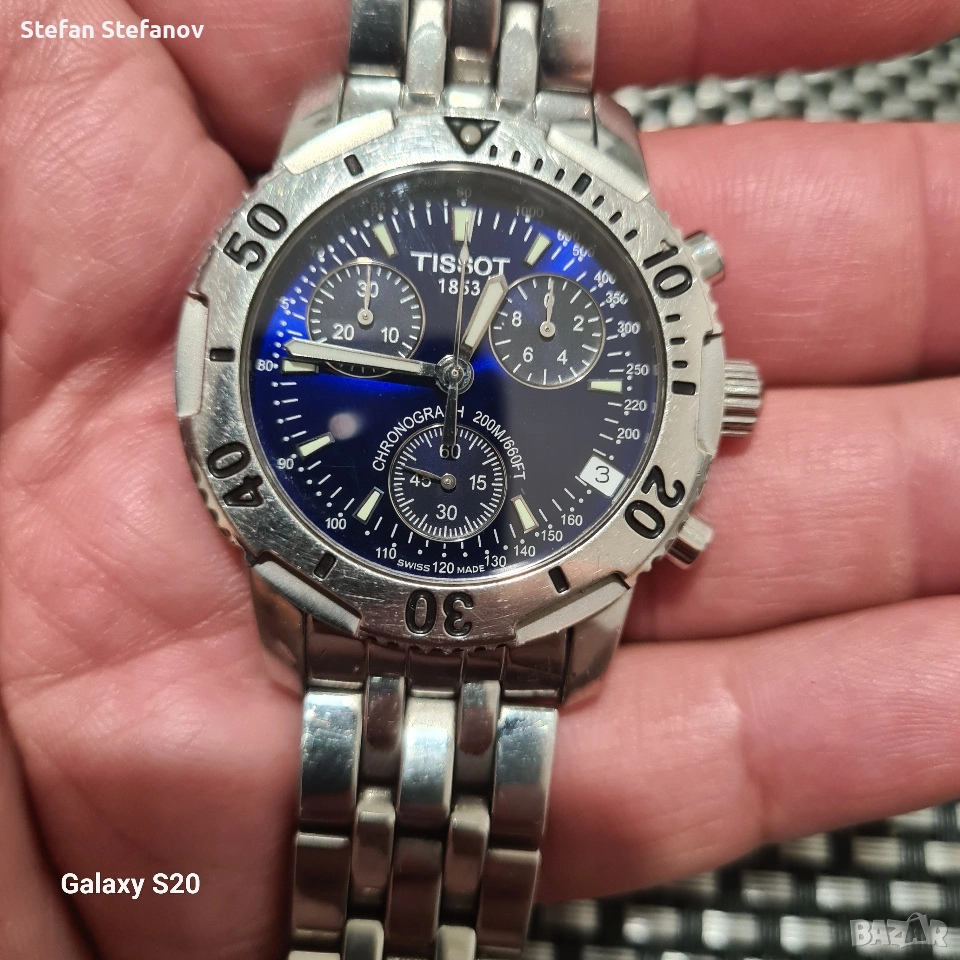 Часовник тисо prs200 хронограф 200м660ft Тъмно син циферблат дата на 4 часа.Напълно обслужен с нова батерия и нова механика.Праща и старата към него.Стъкло сапфир верига с предна и задна закопчалка.