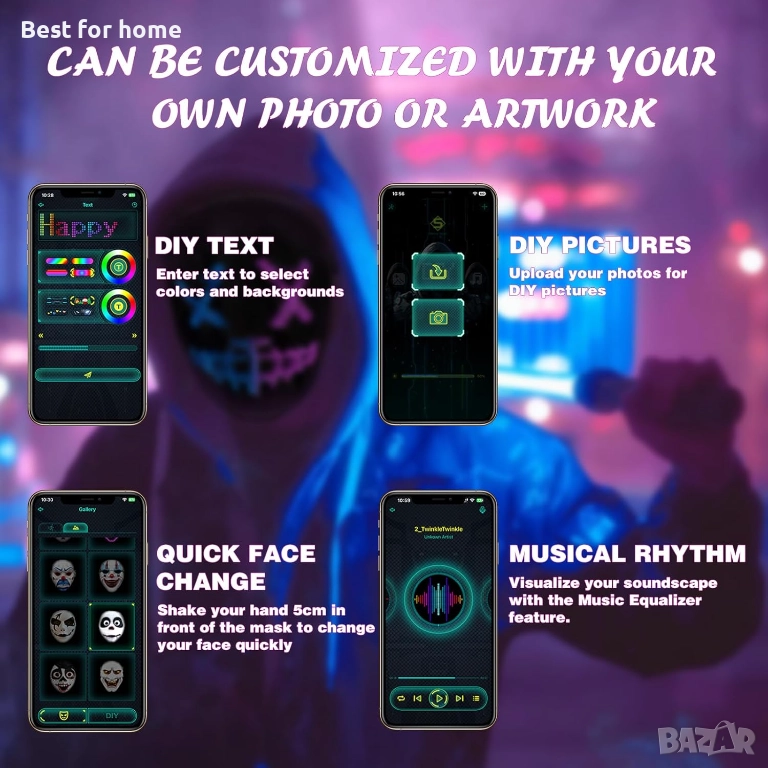 Shining Mask може да въвежда текст в четири режима на показване, включително фиксирано показване, прескачане на текст, движение наляво и движение надясно. „Направи си сам“: можете да рисувате различни шарки, които харесвате, и да ги качвате, които ще се показват върху маската, много забавно!