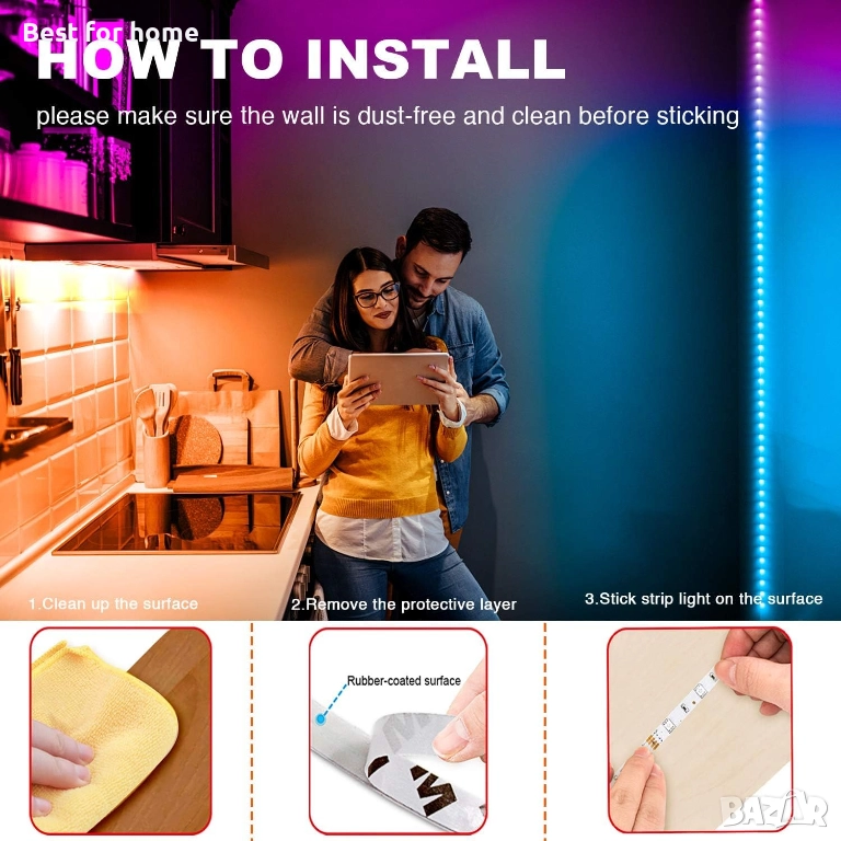 [Лесен за инсталиране] С помощта на усъвършенствана здрава лепяща лента, LED лампите за спалня могат лесно да се залепят върху чиста, суха и равна повърхност. Просто ги свържете към положителния полюс и включете. След това отстранете задния слой. (Няма да светят, ако анодите не са насочени към стрелката)
