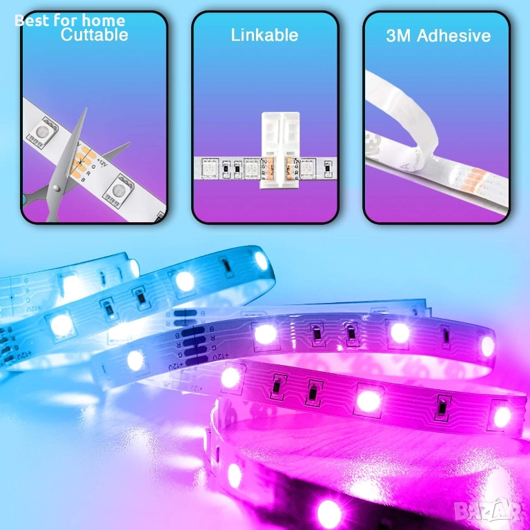 [Гъвкава и режеща се] С маркировки за рязане, можете да създадете различни форми за LED лентата. (Допълнителни конектори не са включени, трябва да закупите допълнителни 4-пинови контакти за повторно свързване)