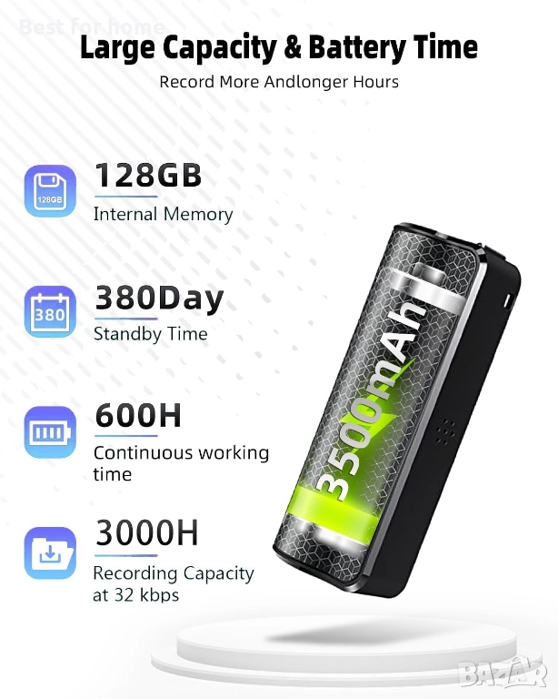 【Мощни функции】Цифровият гласов рекордер е оборудван с карта за съхранение с голям капацитет от 128 GB, осигуряваща до 380 дни в режим на готовност, поддържаща непрекъснат запис до 600 часа и способна да съхранява до 3000 часа файлове.