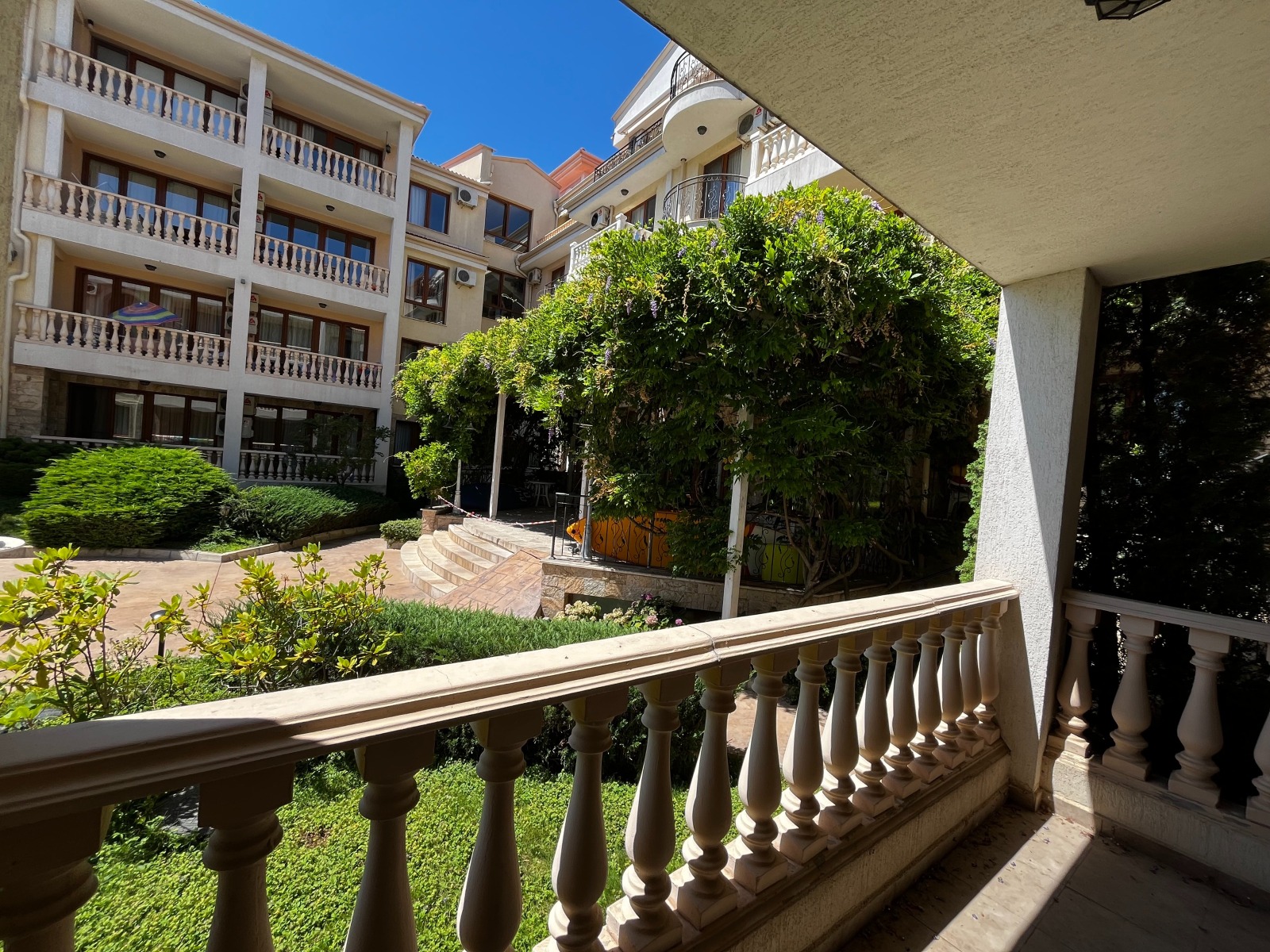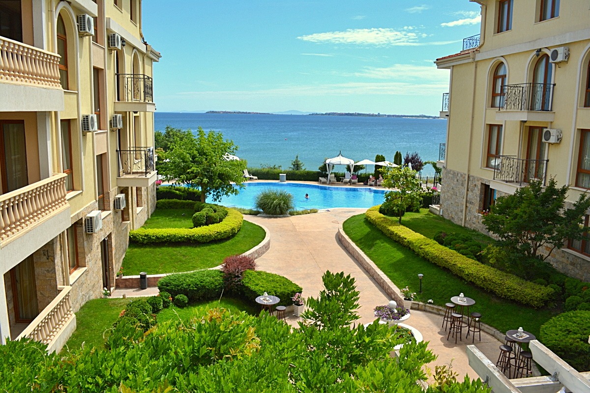 Предлагаме за продажба стилно обзаведен двустаен апартамент с гледка към морето, на първа линия в Свети Влас. Апартаментът се намира на първи партерен етаж в сграда с асансьор и е с квадратура 70 кв.м.. Разпределение: дневна с кухненски бокс и кът за хранене, зона за отдих, спалня, баня с вана и тоалетна, тераса с гледка към морето и басейна. Апартаментът се продава напълно обзаведен и оборудван. Комплексът предлага охраняем паркинг, плувен басейн с детска секция, ресторант, добре поддържани градински площи, целогодишна денонощна охрана и поддръжка. Акт 16 и Разрешение за ползване. Изключително добра локация, в непосредствена близост до плажа, до автобусна спирка, целогодишно работещи разнообразни магазини и заведения.