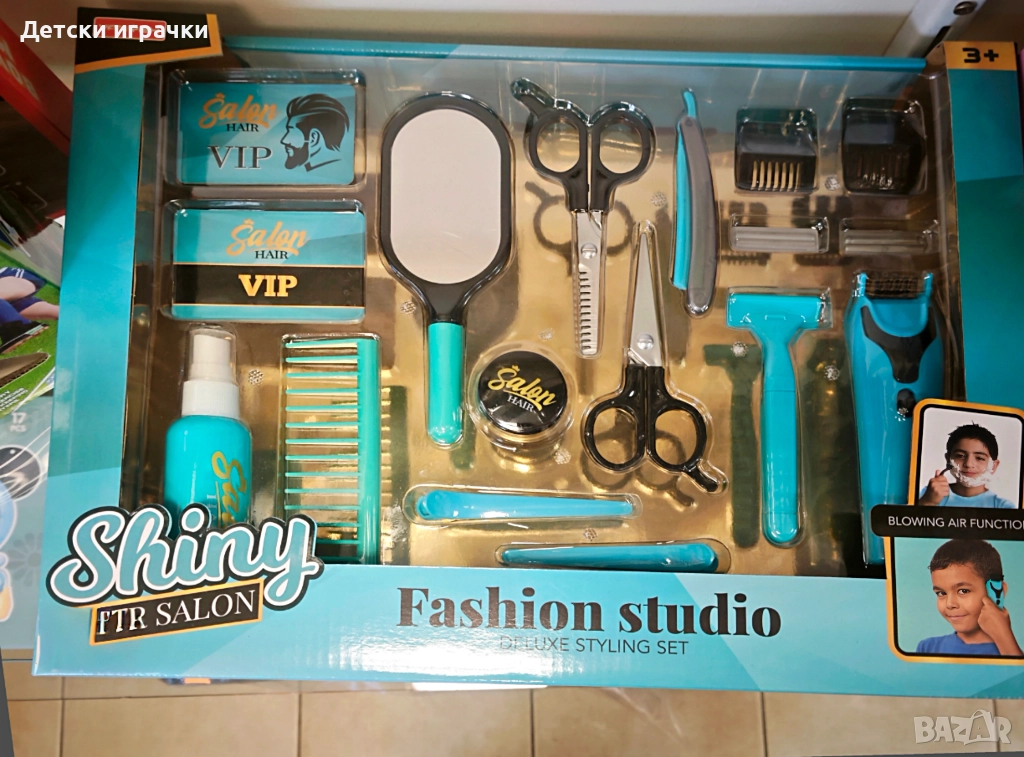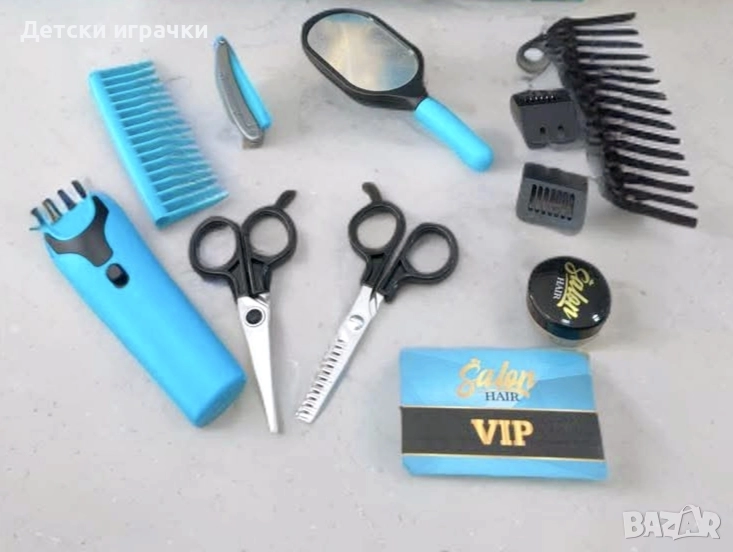 Включва различни аксесоари като огледало, гребен, ножици, машинка за подстригване (играчка) и др..