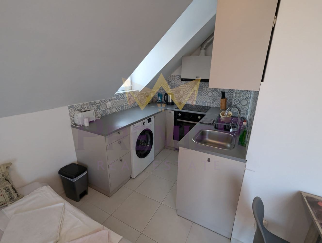 Жилището е по документи един неразделим апартамент, но е функционално разделено на две самостоятелни жилища двустаен апартамент и таванска стая, всяко със собствен вход.