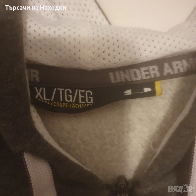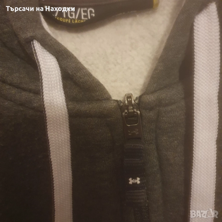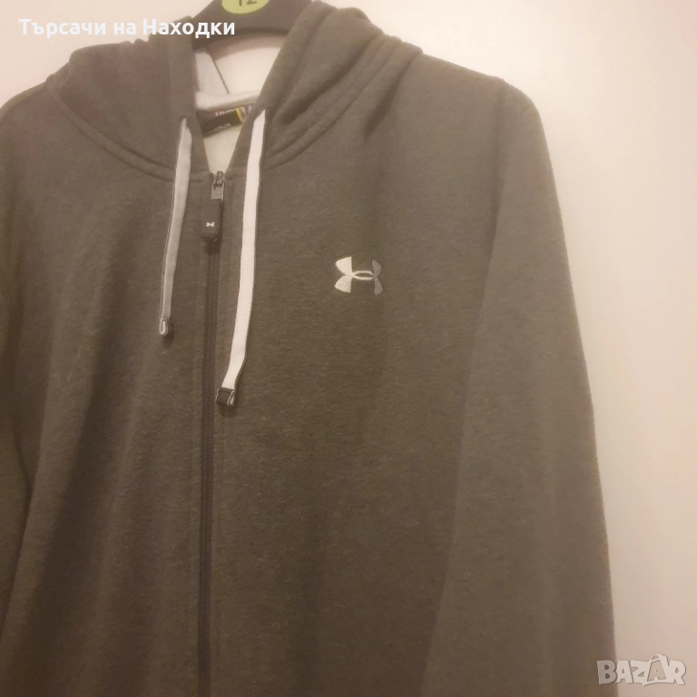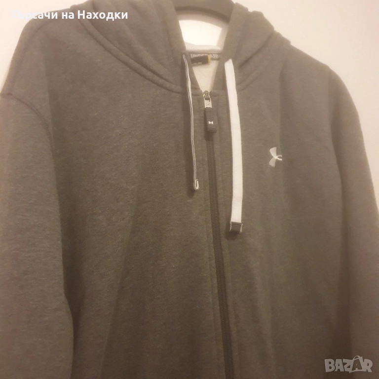 Продавам оригинално мъжко спортно яке/суитшърт с качулка и пълен цип (Full Zip Hoodie) от марката Under Armour. Моделът е изключително удобен и топъл, идеален за тренировки на открито или ежедневно носене в по-хладно време.