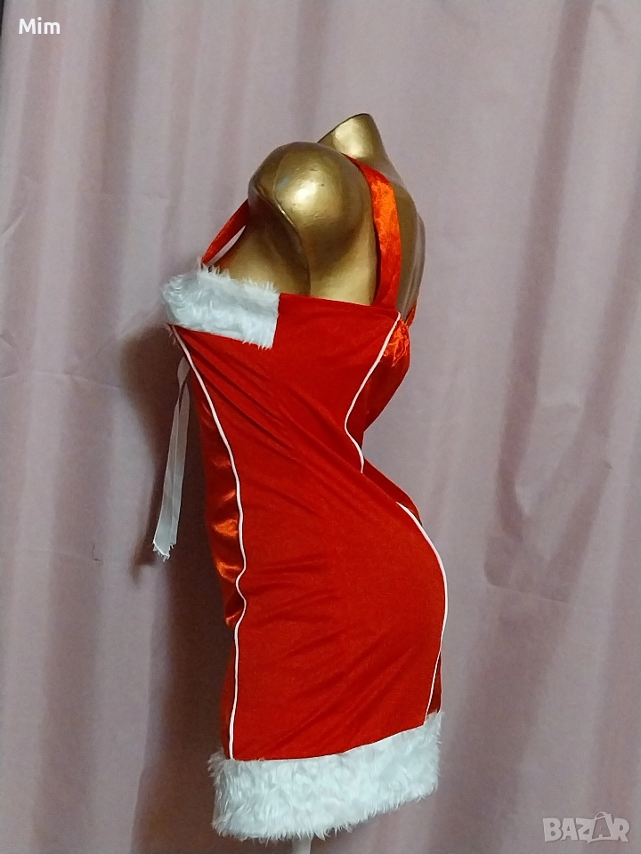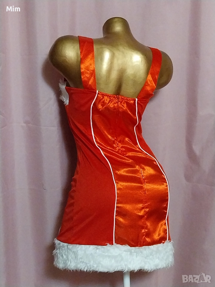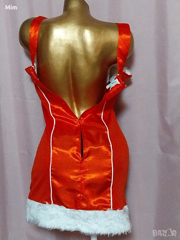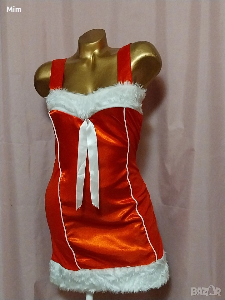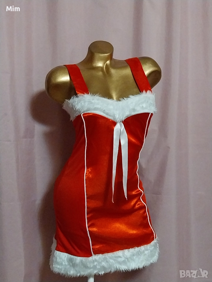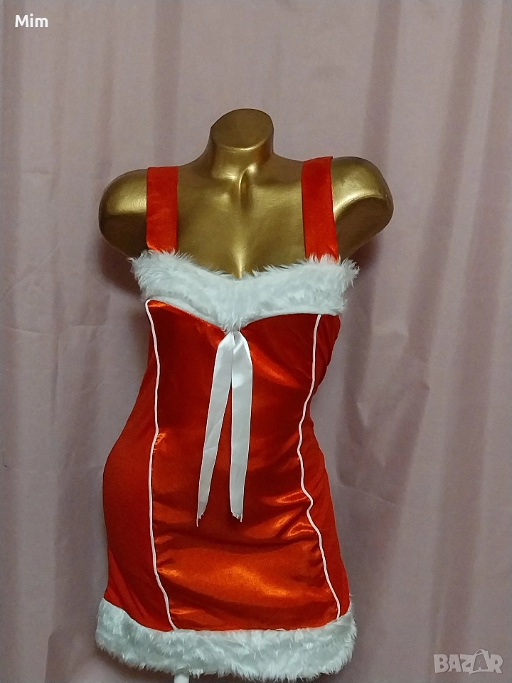 Червен сатен ,странично с еластична материя с бели пухчета на бюста и отдолу с бяла сатенена пандела ,закопчаването е отзад с цип, гръдна 90 см ,талия 70 до 85 см ,дължина 80 см. Няма забележки.