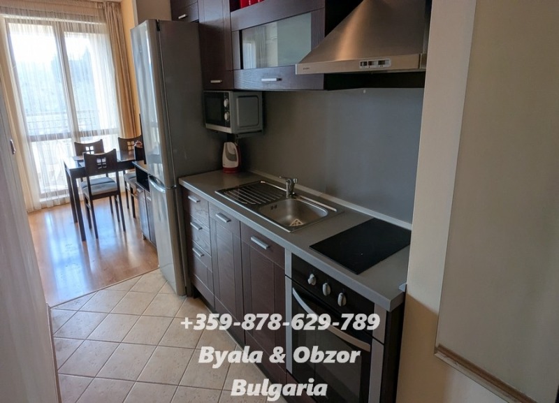 ОБЗАВЕЖАДАНЕ: двойно легло с матрак, нощни шкафчета, разтегателен диван, холна маса, скрин, огледало, трапезна маса със столове към нея, напълно оборудвана кухня, голям хладилник, плот и аспиратор, фурна, електрическа кана, пералня, портманто, климатик
