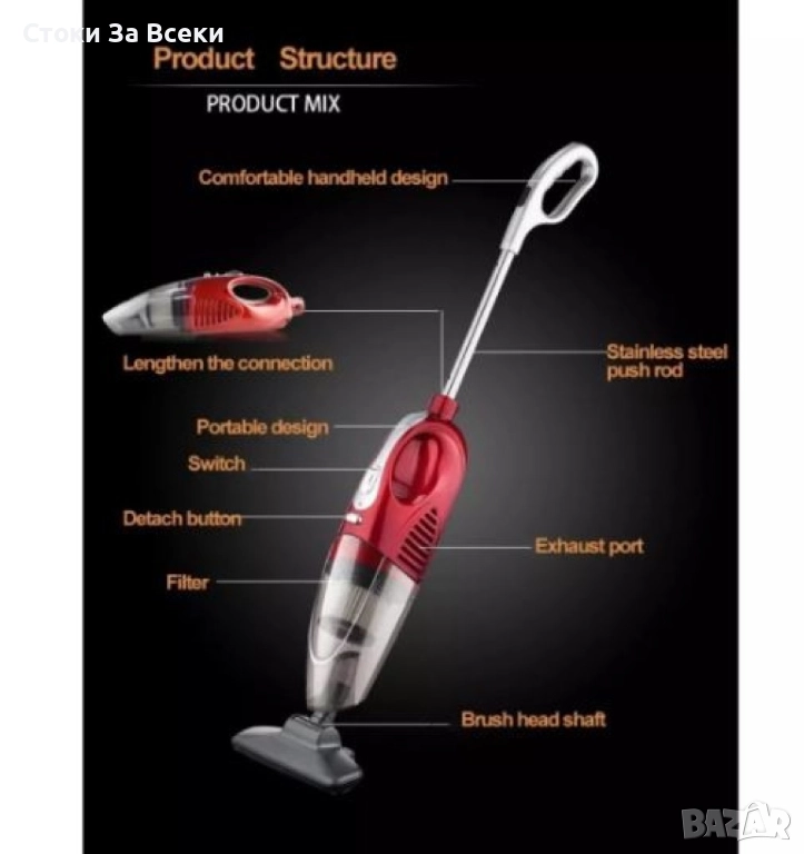 Размер: Дължина на цялата прахосмукачка: 108см, дръжка: 47см, тяло: 47см;