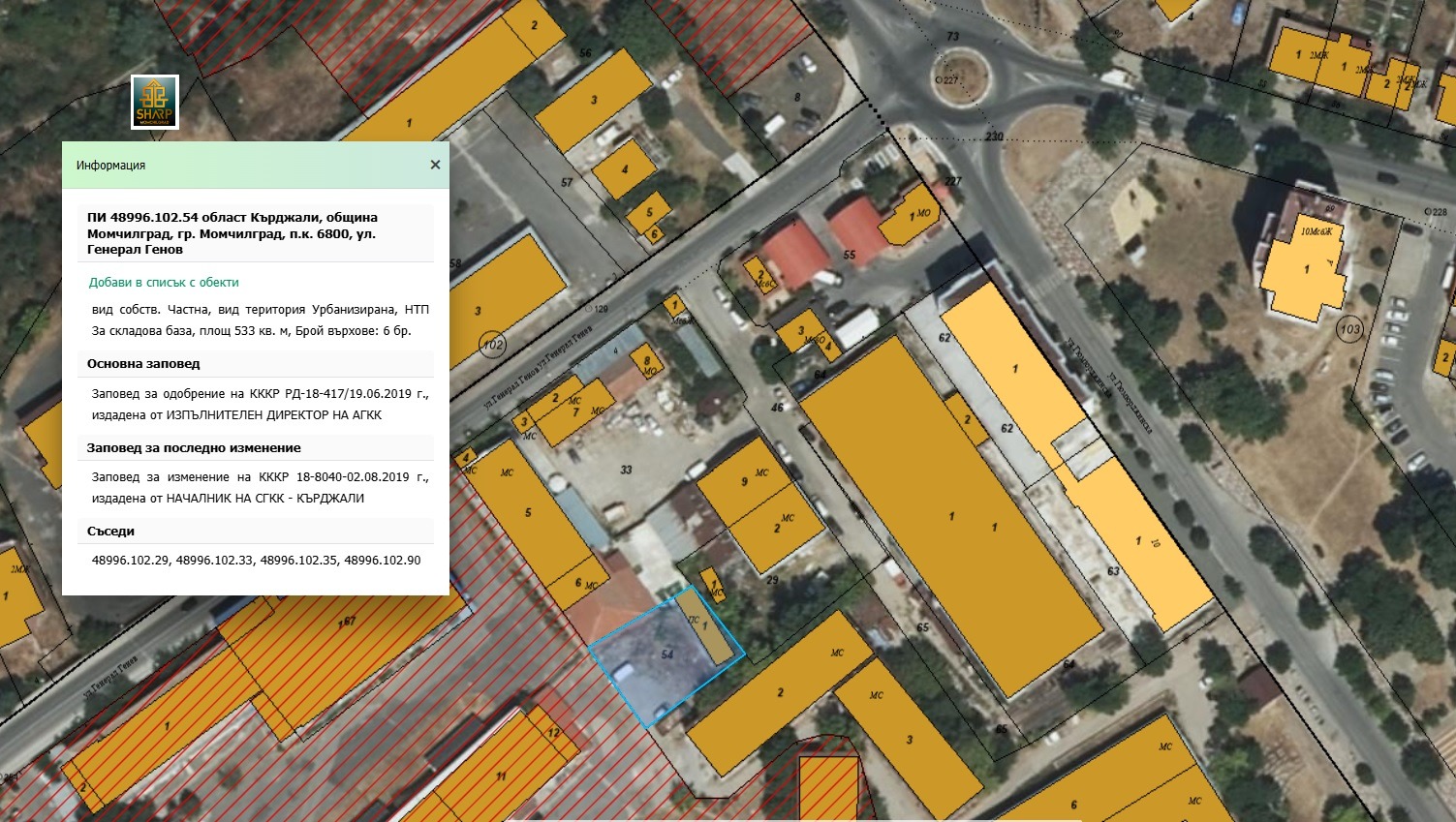 Продава се поземлен имот със построената в нея Промишлена сграда от 82 кв.м. в гр. Момчилград.