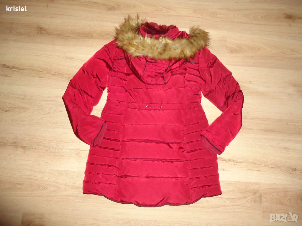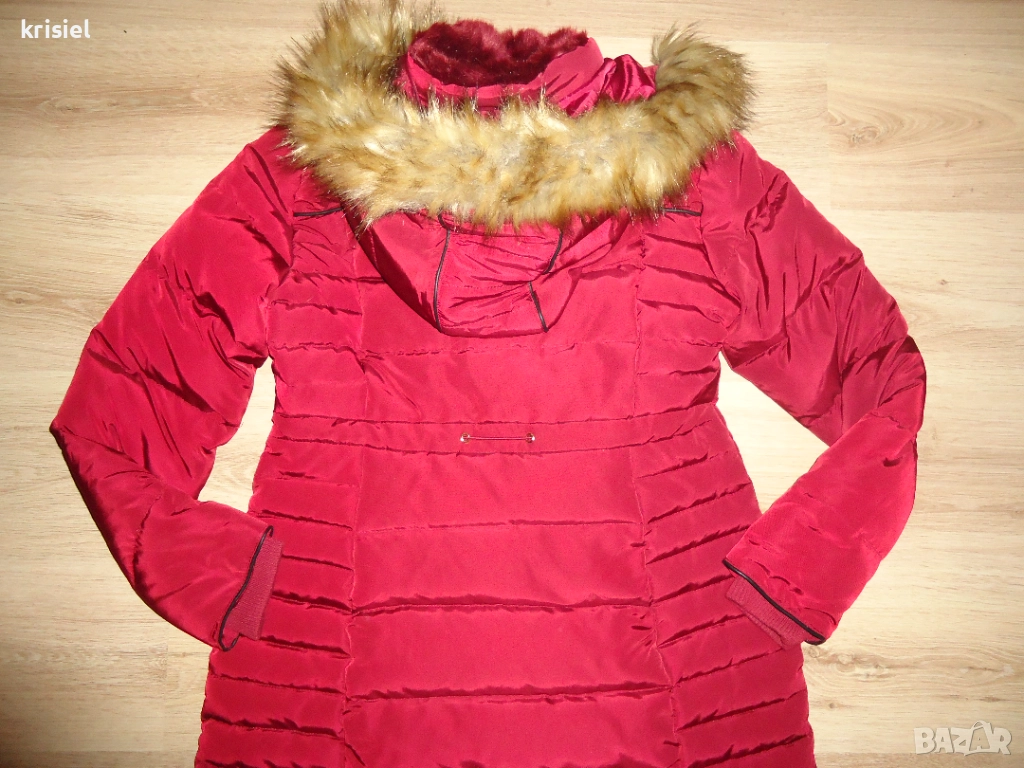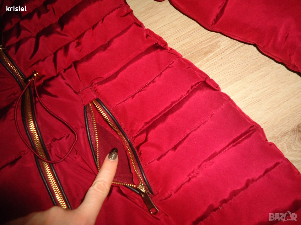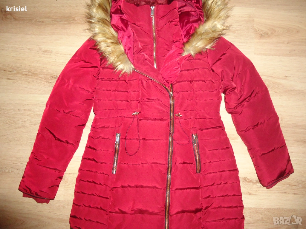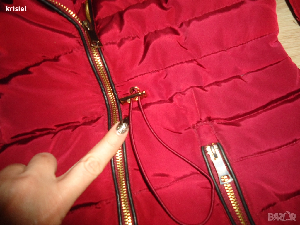 е.Страхотно топло и пухкаво яке е.Изцяло с пълнеж от гъши пух е.Модела му е втален,елегантен.С двуредно закопчаване е,с ципове.Втален модел е.На китките от вътрешната страна завършва