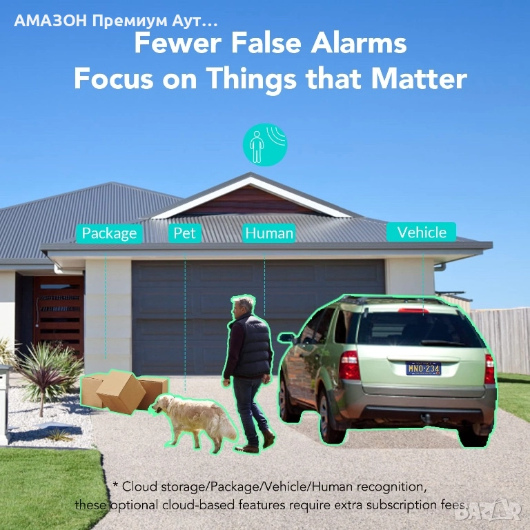 - Бъдете информирани за важни неща: Тази безжична външна камера се задейства от PIR сензор за движение, тя автоматично заснема видеоклипове с движение и изпраща незабавни известия до приложения (БЕЗПЛАТНО). В сравнение с конвенционалните сензори за движение, PIR сензорът значително намалява фалшивите аларми. *Можете също да се абонирате за услуга за идентификация с изкуствен интелект, която да ви помогне да филтрирате по човек/превозно средство/пакет/животно (услугата с добавена стойност изисква допълнително заплащане).