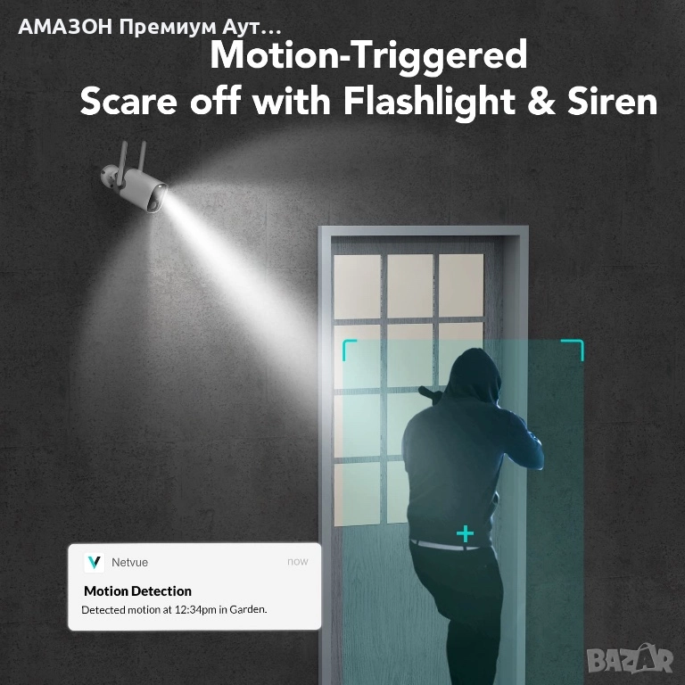 - Чувайте и говорете в реално време: Тази безжична външна охранителна камера е оборудвана с вграден микрофон и високоговорител с шумопотискаща функция. Можете да чувате и говорите с посетителите в реално време чрез приложението Netvue. Или да предупредите неканени гости със сирена и фенерче.