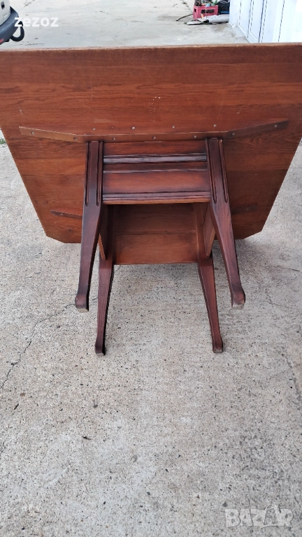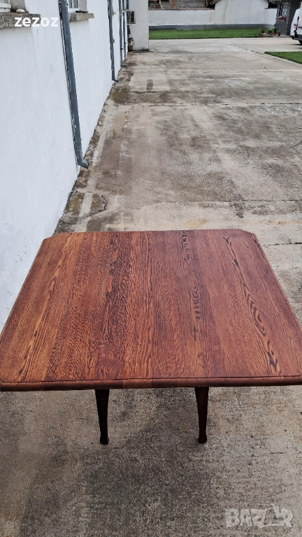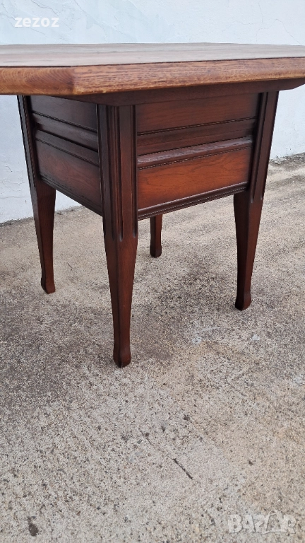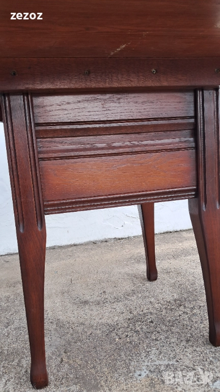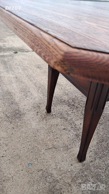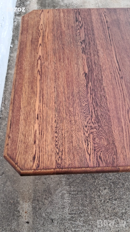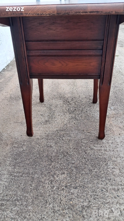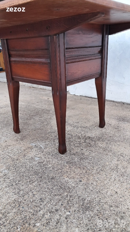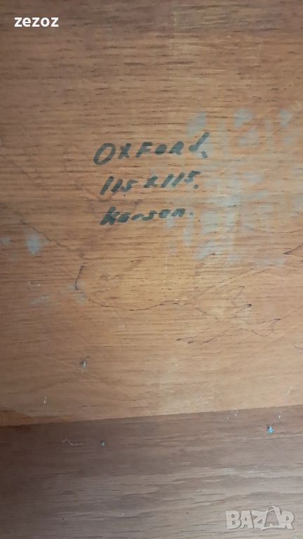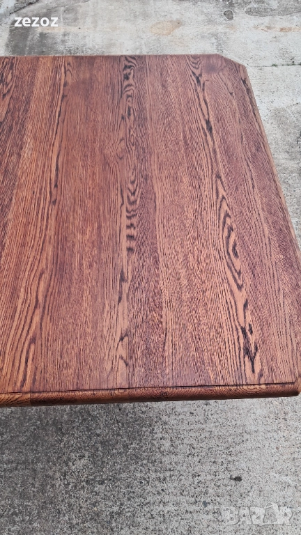 Масата е английска с нестандартен вид и размер на плота.Пълен масив дъб.На дъното има надпис.Най-вероятно е от инвентара на някой от Оксфордските университети.Или е била в столова или в библиотека.Масата е конструктивно много здрава и за годините си е в много добро състояние.Единствено има лека забележка по долния ръб на борда на един от ъглите,видимо на снимките.Размери-