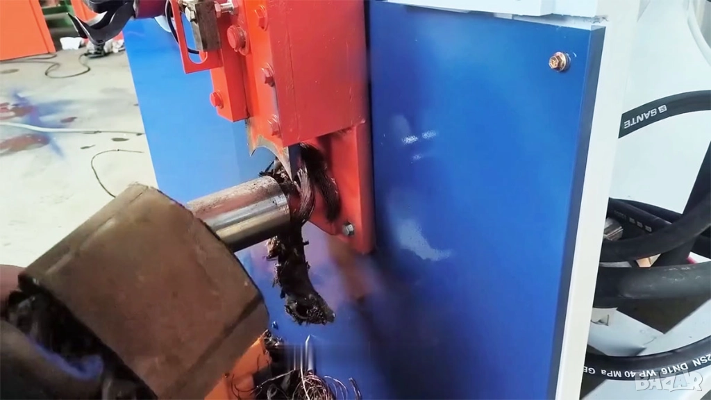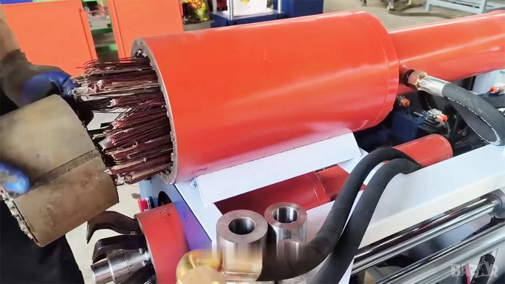 Операцията включва поставяне на статора на двигателя под режещото острие, ръчно завъртане след всяко рязане и след това прехвърляне на отрязания статор към съответната издърпваща част за извличане на медните намотки.