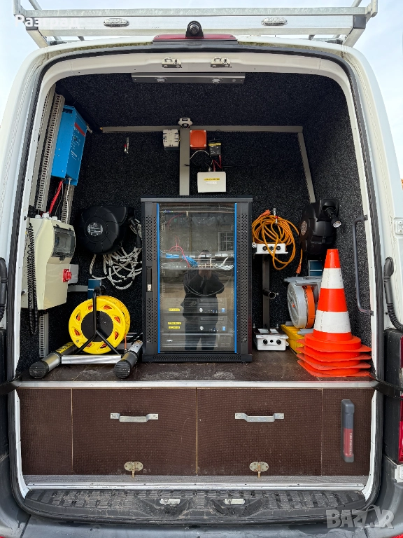 Продавам микробус Mercedes Sprinter 313CDI 2011г. с оборудване за видеонаблюдение. Интериора в товарното помещение е разделен на две части, като едната е преобразувана в офис - с напълно облицован интериор , бюра и монитори, а сървърите и техниката са отделени в задната част. Разполага с 2бр. професионални камери с голям zoom ,монтирани на тавана и 4бр. камери на стойки. Вътре са монтирани 7бр. монитори за наблюдение.Всички съоръжения са монтирани и подвързани от професионална фирма в Нидерландия, със сертификат. В изправност и готови за работа, като мобилен офис за видеонаблюдение или охрана на събития и обекти.