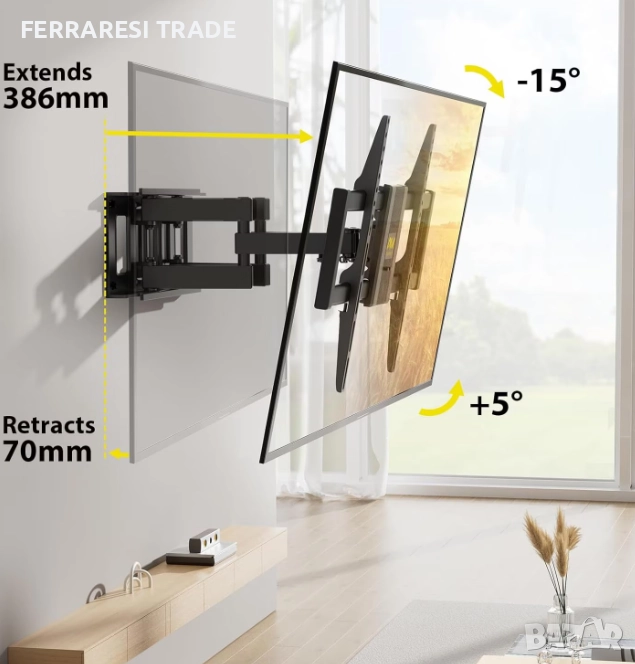 Тази практична стойка пасва на повечето телевизори с плосък панел до 40 кг. Пълното регулиране на движението позволява максимална гъвкавост — +3°~-15° накланяне, +60°~-60° завъртане и +3°~-3° нивелиране на екрана на телевизора за оптимално гледане от всяко място в стаята.