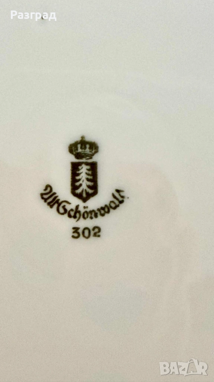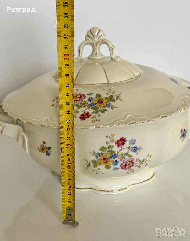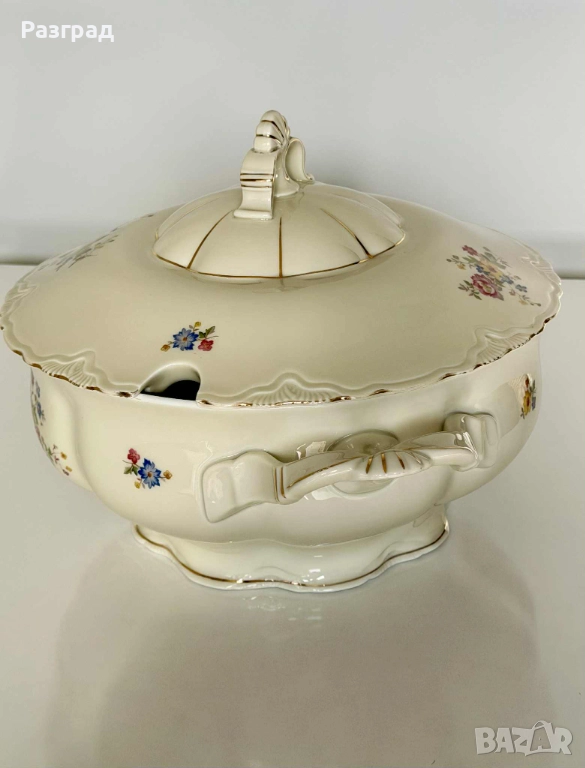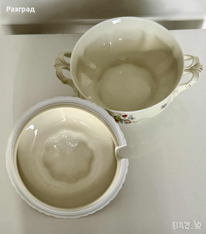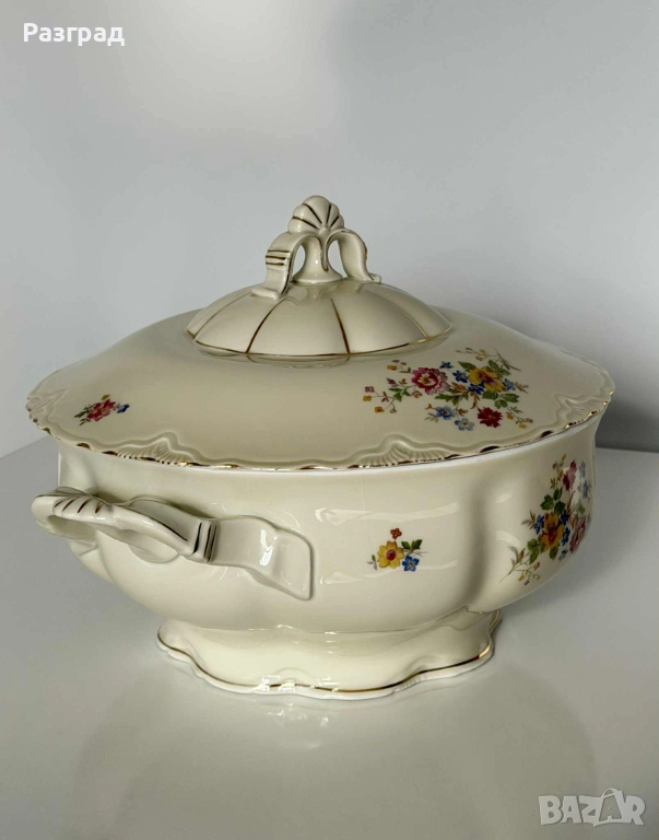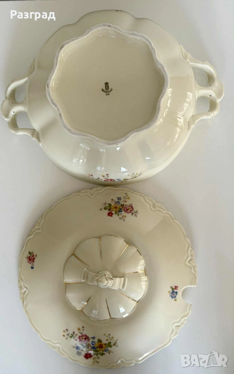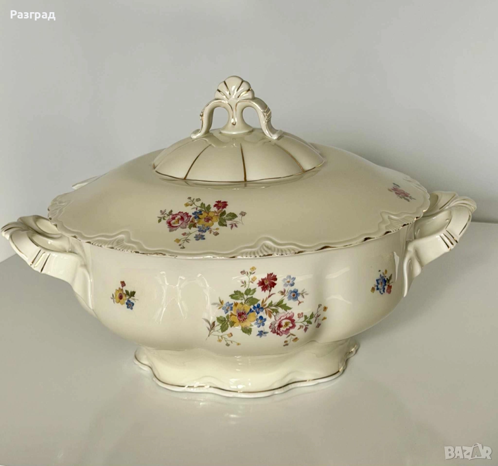 Винтидж супник с голям обем > 4 литра. С красиви релефни извивки върху нежно кремав цвят на порцелана / слонова кост. Декориран с цветни букети и завършен със златен кант. В чудесно винтидж състояние. Произведен в Германия преди приблизително 100 години от Schönwald. Маркиран.