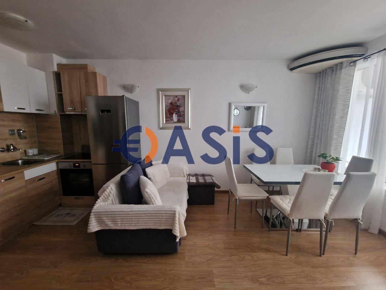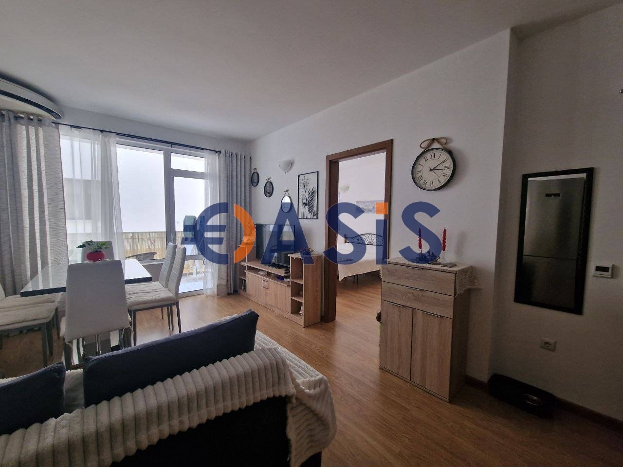 Състои се от всекидневна с напълно оборудвана кухня, две отделни спални, тераса, санитарен възел. Апартаментът се предлага за продажба с мебели и уреди, напълно готов за живеене. Всички стаи имат подово отопление! От оборудването има фурна, готварска повърхност, два хладилника, пералня, климатик и други домакински уреди. Апартаментът е много уютен, с добър ремонт. Комплексът е подходящ за целогодишно ползване с акт 16.
