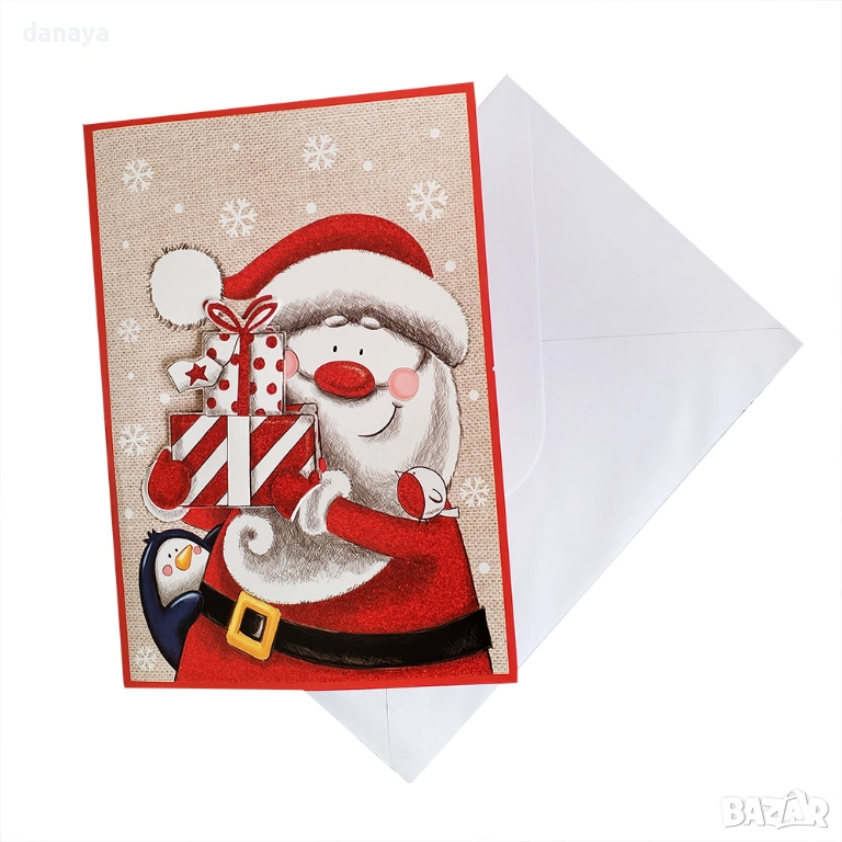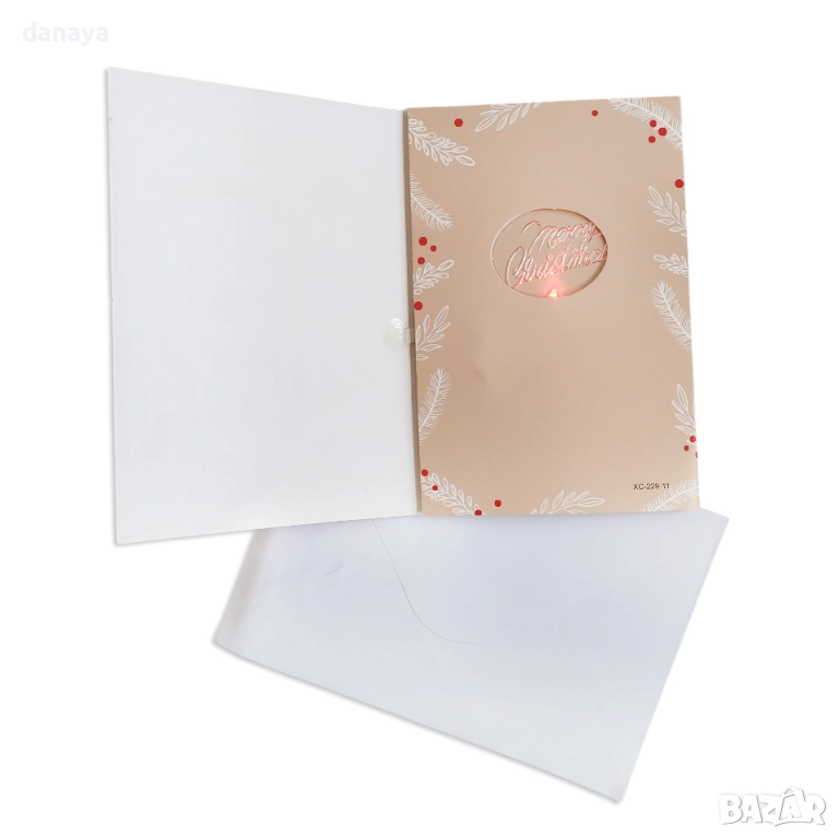 Включеният бял плик придава завършен и изчистен вид, подходящ за поднасяне към подарък, букет или коледен пакет. Вътрешната част предлага достатъчно пространство за персонално пожелание, което превръща картичката в истински специален спомен.
