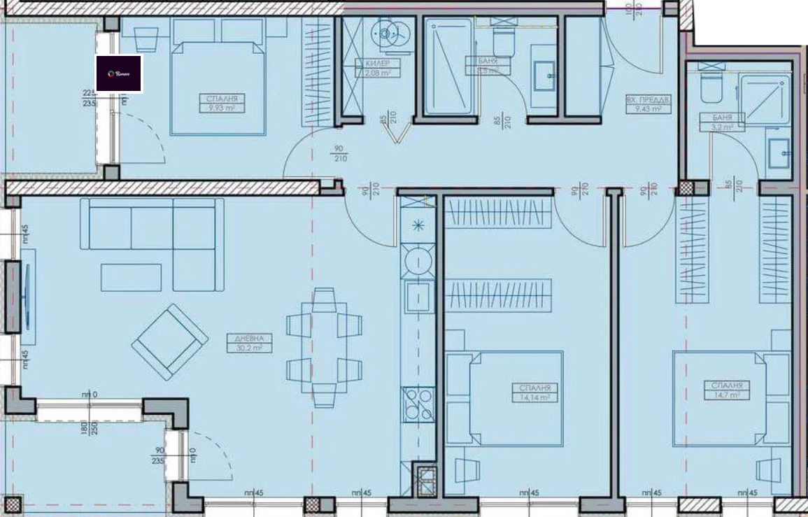 Разпределението е функционално, помещенията са светли, с правилни форми, което улеснява проектирането и реализирането на интериорните решения.