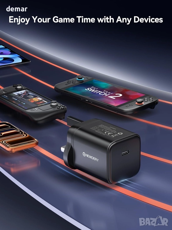 Зарядно устройство NEWDERY 65W GaN за Nintendo Switch 2 (TV режим), Steam Deck, ROG Ally, iPhone