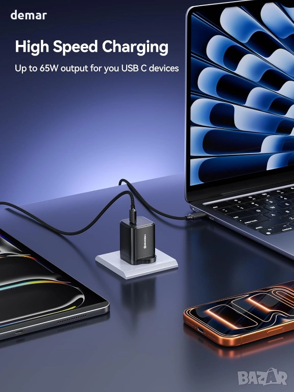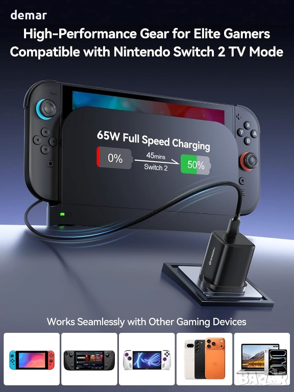 Това 65W GaN зарядно устройство е проектирано за бързо и стабилно захранване, поддържащо безупречен Nintendo Switch 2 TV Mode и бързо зареждане от 0 до 50% за около 45 минути. То предлага широка съвместимост с игрови конзоли, лаптопи, таблети и смартфони, използвайки PD 3.0 и PPS за оптимални скорости. Включен е издръжлив 1,5-метров оплетен USB-C кабел, поддържащ до 100 W за бъдеща употреба. Вградените системи за безопасност предпазват от прегряване и късо съединение за надеждна работа.