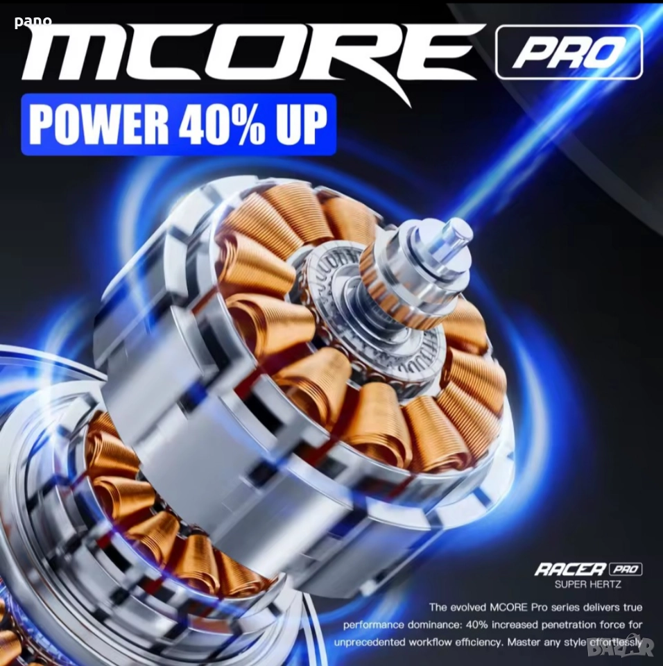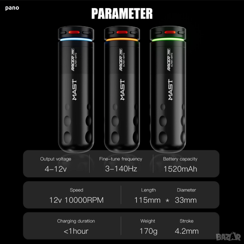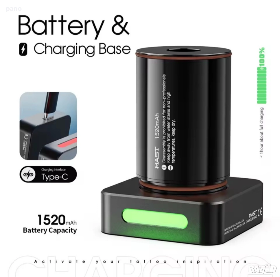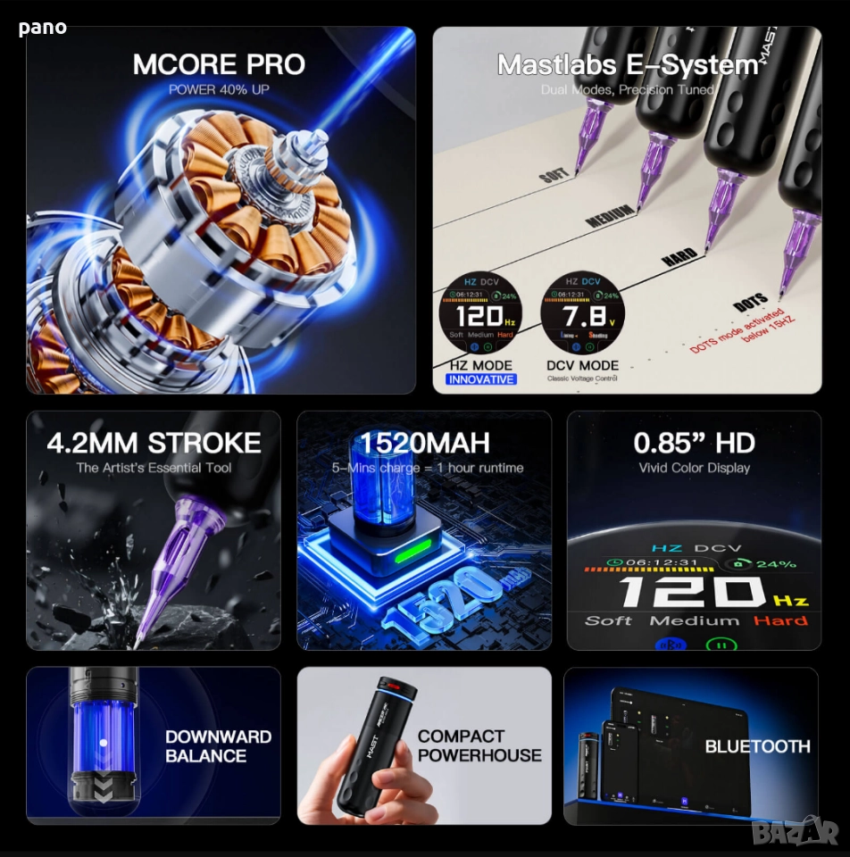 Размери на машинката- височина 115мм, диаметър33мм, и тегло 170гр. Строук 4.2мм. Капацитет на батериите 1520мАч. Издържаща до 5 часа всяка, и време за зареждане 1 час(ultra fast charging). Батерията е поставена под ръкохватката, с цел перфектно балансирана машинка със супер малък размер. Компактен, и ергономичен дизайн. Мощен Mcore pro безчетков мотор,(12v-10000RPM).С повишена мощност до 40%. Повишена сила на проникване за безпрецедентна ефективност на работния процес. Овладейте и стилизирайте без усилие. Система Mastlabs E- system с прецизно настройване. Работни честоти от 4-до12волт, и от3-до140херца. Soft/Medium/Hard/Dots(Иновативно за марката) Режим за прецизно настройване на силата на удара, за всеки стил.(Портрети/реализъм/традиционни/цветни, и др.) DOV mode. Цветен дисплей, High-resolution(0.85'' 213ppi) изобразяващ времетраене, %батерия,V/HZ, плей/пауза, софт/медиум/ хард, и блутуут.Bluetooth възможност за свързване с други устройства, или безжичен педал, за традиционналистите. Elite Upgrade. Professional's Choice. Facebook PANDA tattoo supply