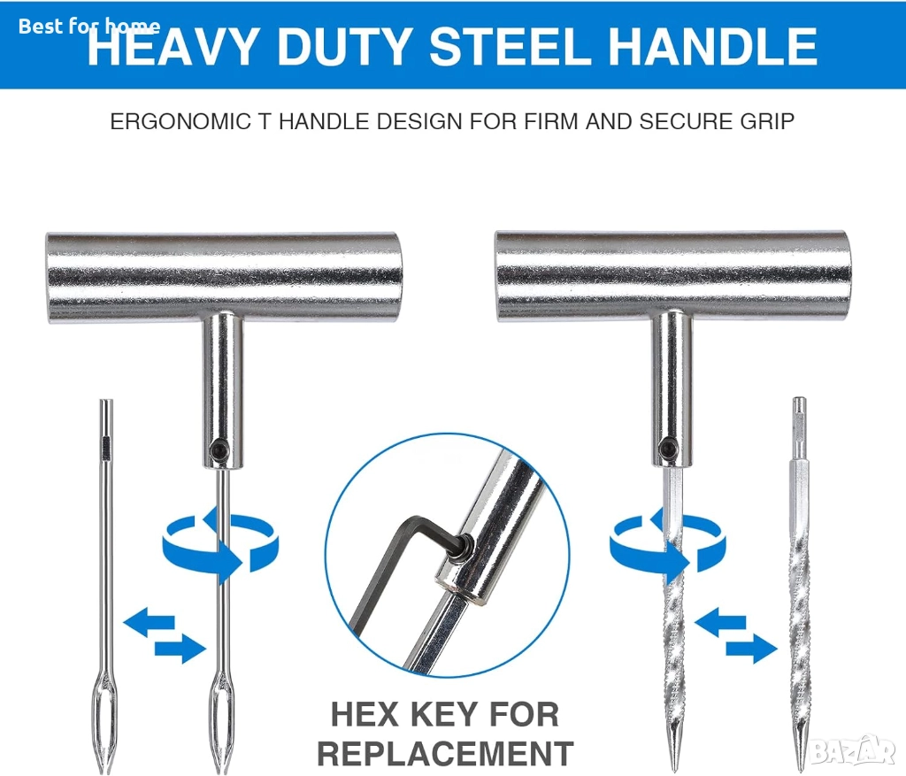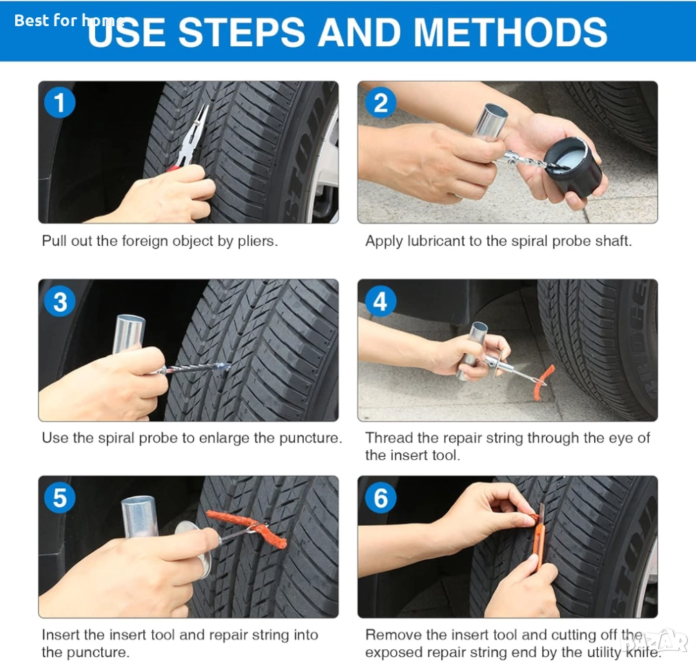 【Лесен за носене и лесен за употреба】 Целият комплект инструменти се побира в преносима чанта, която е малка, лесна за носене и не заема място в колата, което е много подходящо за носене по време на шофиране. Тези инструменти за ремонт на гуми могат да извършват ремонт на гуми самостоятелно, дори и от отделни лица.