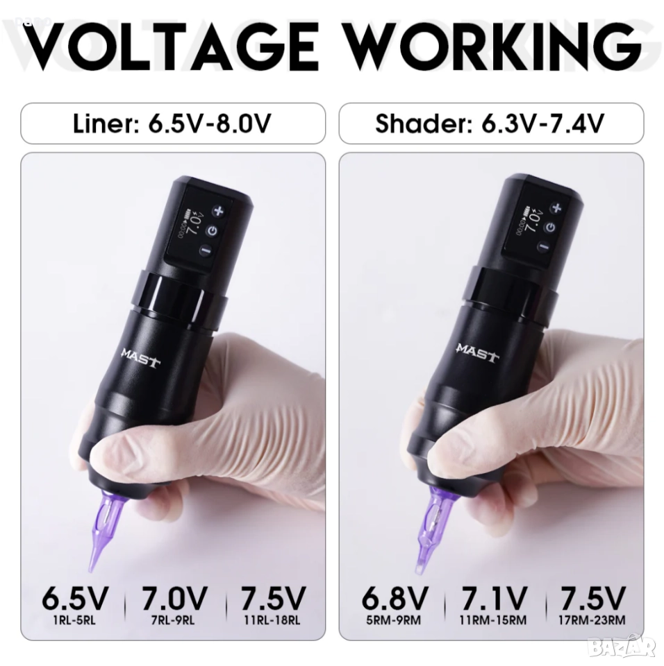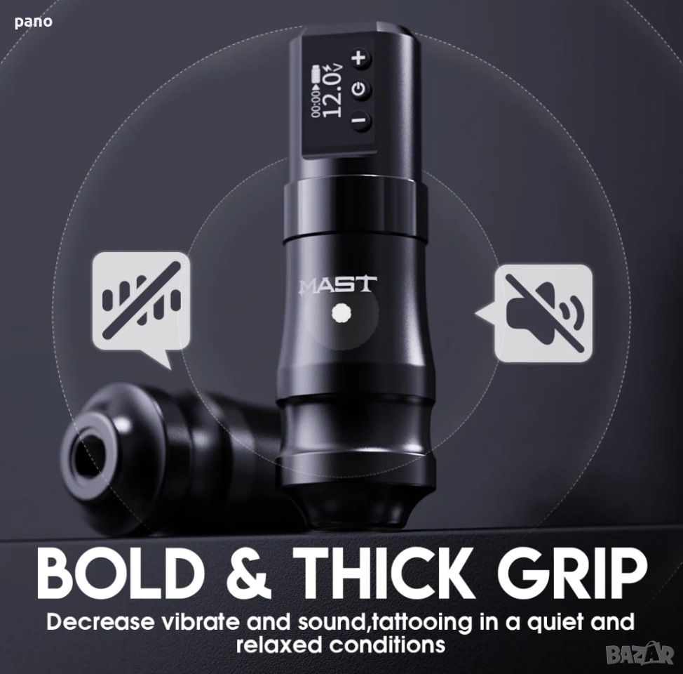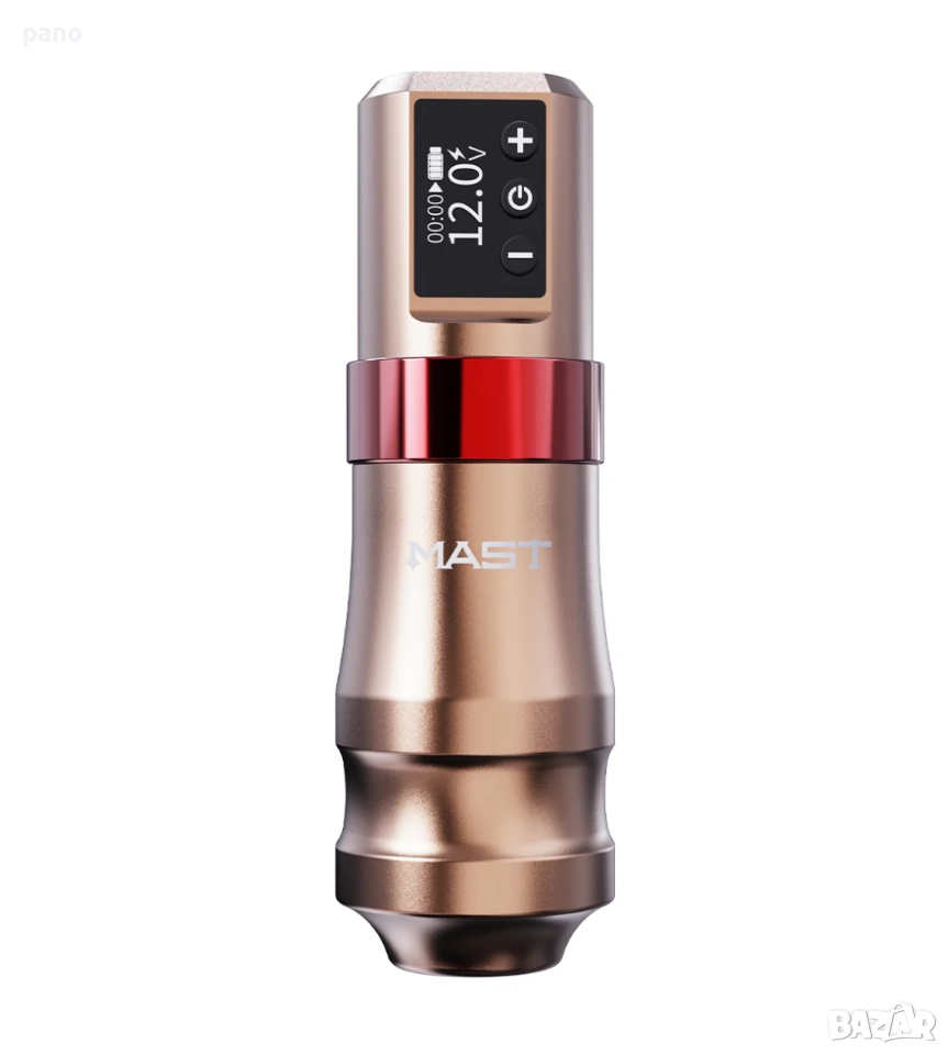 (340лв) MAST Mini tattoo kit С 2 батерии, и RCA адаптер. Цвят- златна. Нов комплект за татуиране включващ- Mast mini машина, втора батерия, Рца адаптер за връзка с кабел, и траф, или допълнителна батерия. Рца кабел, и кабел за зареждане Тайп Си. 20бр. Кутия игли Маст про, черна боя, стерилни капачки за боя-2 размера, изкуствена кожа+индиго, бинт за опаковане, гривна Маст, ръкавици, и стикери. МАЛКА, МОЩНА, УДОБНА, ЗА ВСЕКИ! Размери- 120ммХ38мм, и тегло210гр. Mcore С1 Мотор-coreless (12v 12000rpm) Работещ много гладко, и намаляващ шума, и вибрацията. Строук-3.6мм, (но усещането е като при 4.0/4.2.) Регулиране на волтажа от 4-12волта. Капацитет на батериите 1600мАч, издържаща 6-8 часа всяка, и време за зареждане 1.5 часа. Дисплей, изобразяващ времетраене, волтаж, % на батерия, плей/пауза, и джъмп старт. Идеална за дълги сесии, идеална за всеки тип кожа, идеална и за начинаещи артисти. Удебелена ергономична, комфортна ръкохватка, за по добро удобство, захват, и перфектен баланс. Клик система на ръкохватката, за настройване дълбочината на иглата, клик система при смяната на батериите.Вибрации-0.2м децибели-27-35 Facebook PANDA tattoo supply