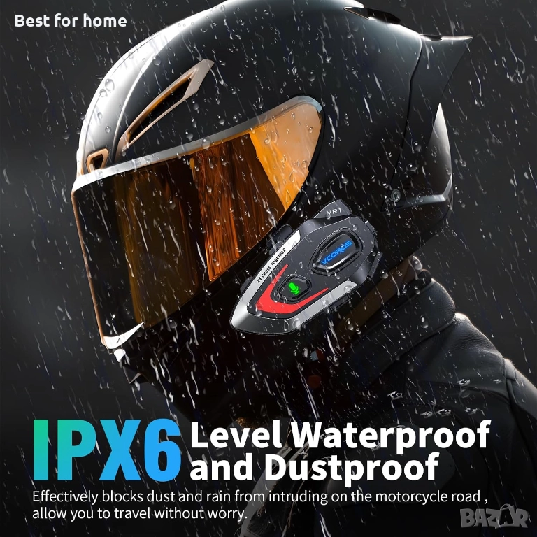 Водоустойчив и прахоустойчив IPX6: този мотоциклетен Bluetooth има водоустойчива функция IPX6, без страх от прах и дъжд, за да осигури безпроблемно пътуване. Плътно структурираната и здрава водоустойчива конструкция ефективно блокира мотоциклета на пътя от нахлуване на прах и дъжд, така че можете да пътувате без притеснения.