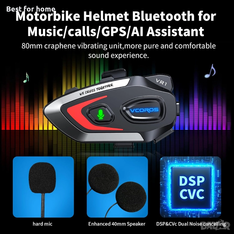 Мотоциклетни слушалки VR1, Мотоциклетни слушалки за един човек, Мотоциклетни слушалки Bluetooth, Водоустойчиви IPX6, DSP и CVC шумопотискане, Мотоциклетна каска Bluetooth за разговори със свободни ръце, Музика.