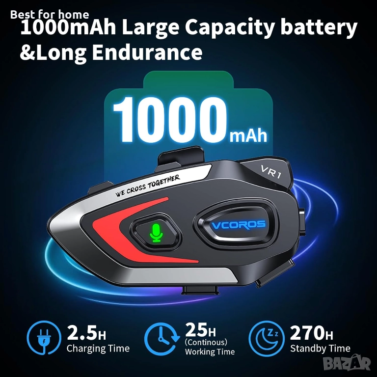 Гласови команди и дълго време на работа: слушалките за мотоциклетна каска имат функция за гласови команди, която издава звуци като „включване“, „сдвояване“, „свързано“, „изключване“ и улеснява настройката и изпълнението на процеса. Слушалките за мотоциклетна каска са с вградена акумулаторна литиево-йонна батерия, с до 25 часа работа. В режим на пестене на енергия, те се изключват автоматично след 10 минути, ако не е сдвоено работещо устройство.