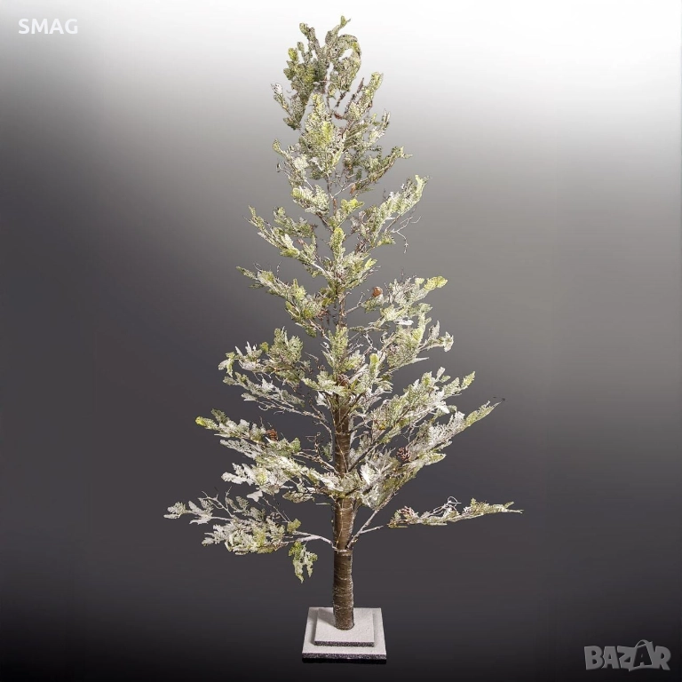 Коледна елха с отрупани със сняг клони, естествени шишарки и 600 LED лампички, които светят постоянно. Има дървена основа и лесно сглобяване. Работи на ток (6W – 220V) и има кабел 2.5m. Подходящо е и за външна употреба, при условие че е добре защитено от неблагоприятни метеорологични условия (дъжд, сняг, вятър).