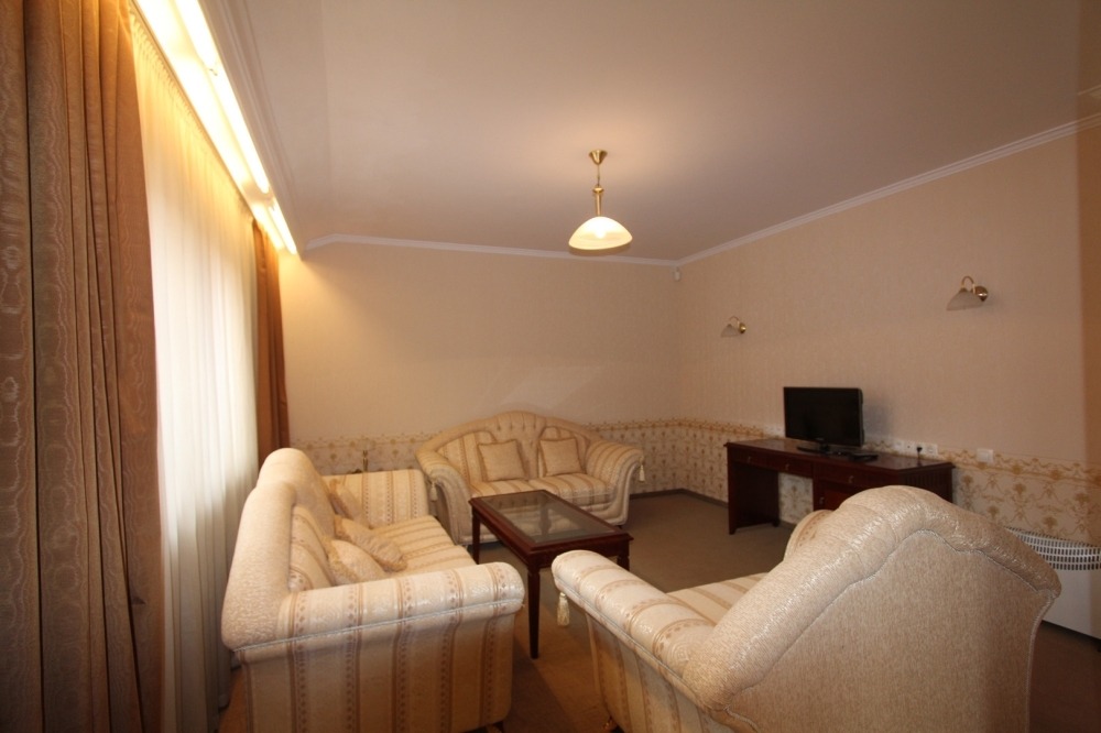 Всекидневнатае обзаведена с мека мебел, холна масичка, телевизор; кухненско оборудване - горни и долни шкафове, мивка, фурна, котлони, трапезна маса със столове. От хола се излиза на тераса, която е с изглед към двора на комплекса.