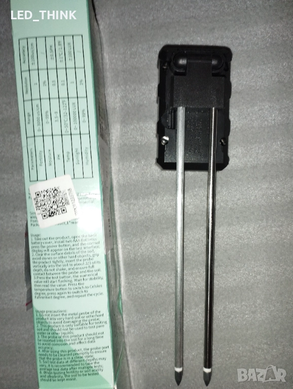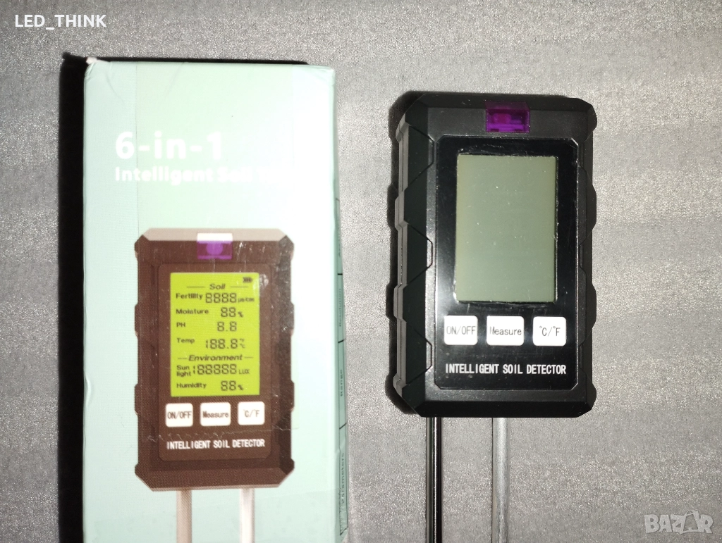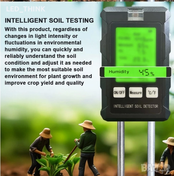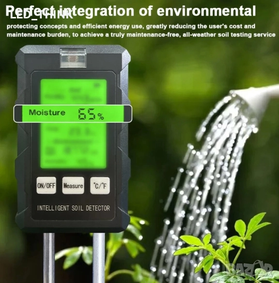 Измерва влажност, температура, осветеност, съдържание на хранителни вещества. Работи с две батерии ААА.