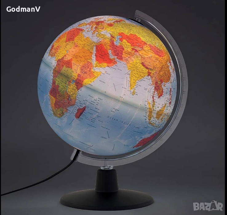 Глобусът е идеален както за декорация, така и за учебни цели – когато е включен, светлината подчертава детайлната картография и прави континентите и държавите още по-ясни.