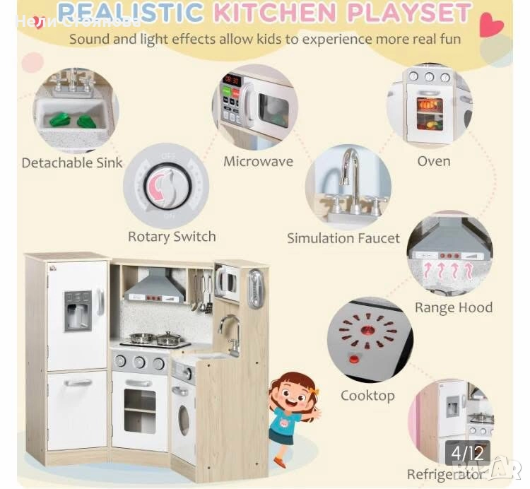 Място за съхранение: Няколко рафта и шкафове предлагат просторно място за съхранение на огромно количество кухненски принадлежности за игра, което позволява по-забавен дизайн, съдържащ изобилие от играчки. Подарете на детето си играчка, която държи играчки в нея.