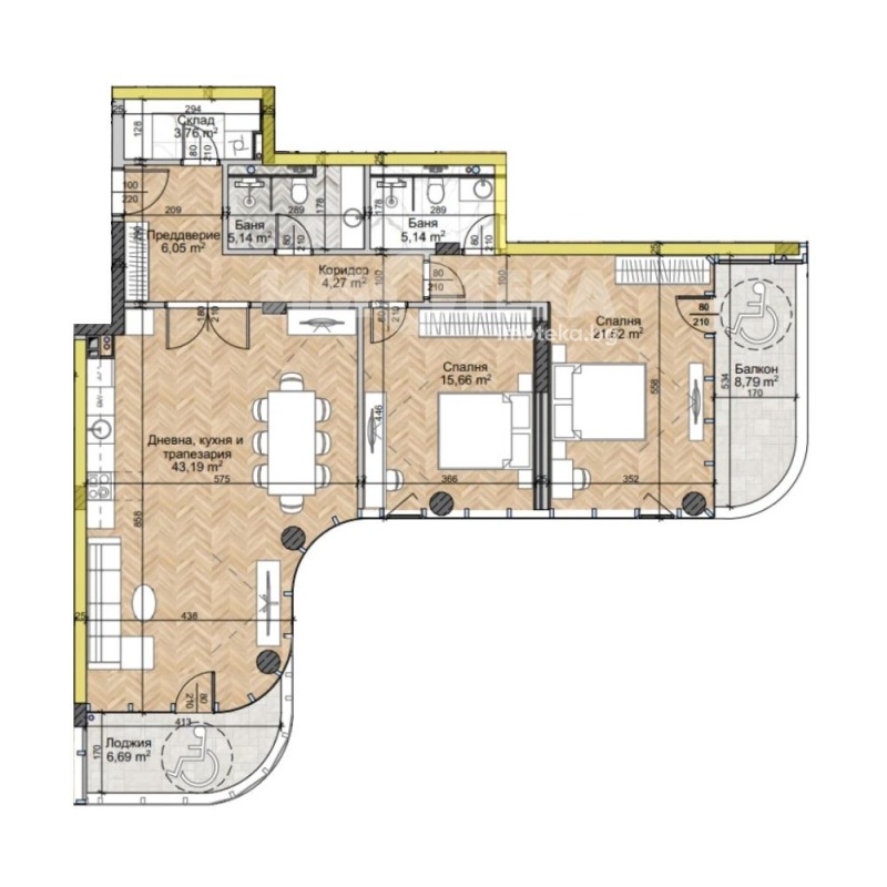 Огромен тристаен апартамент с югозападно и югоизточно изложение, състои се от просторна дневна - 43 кв.м., две големи спални, съответно 15 и 21 кв.м., две бани, склад и две тераси. Изключително модерна и впечатляваща сграда, бъдеща емблематична точка в района, съчетава стратегическа локация, съвременна архитектура и удобства от най-висок клас.