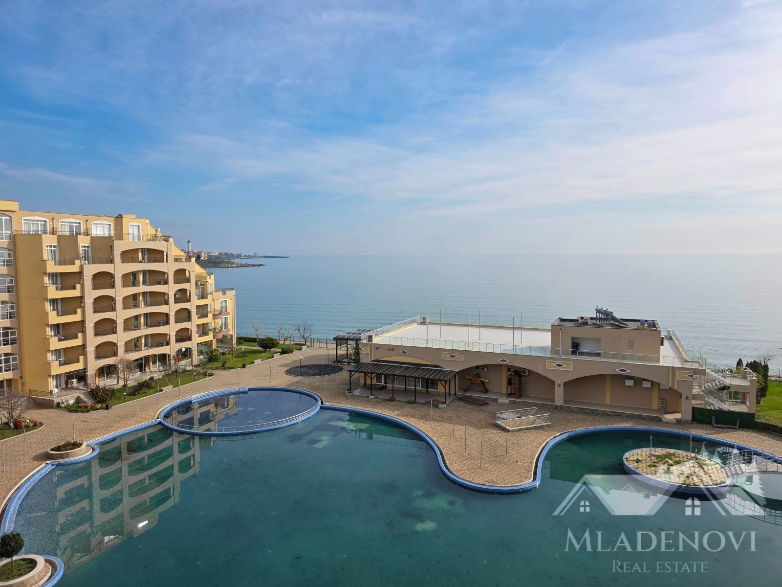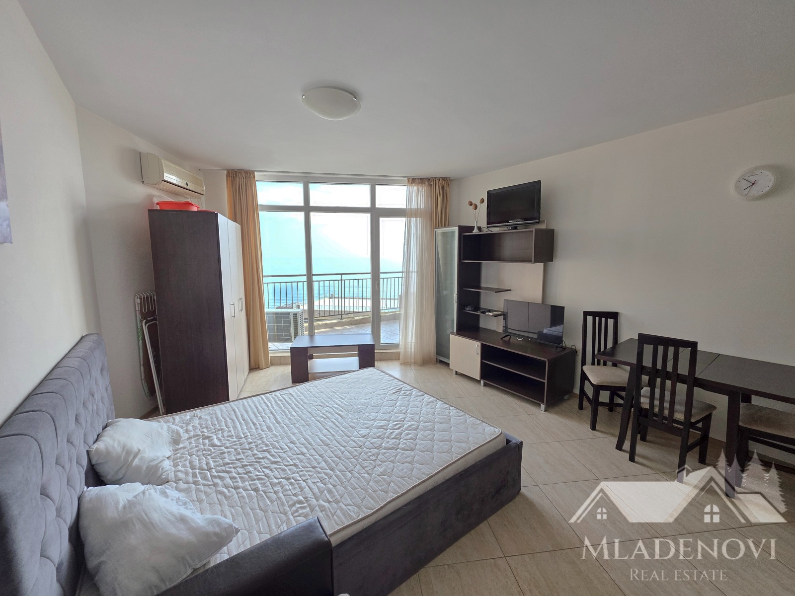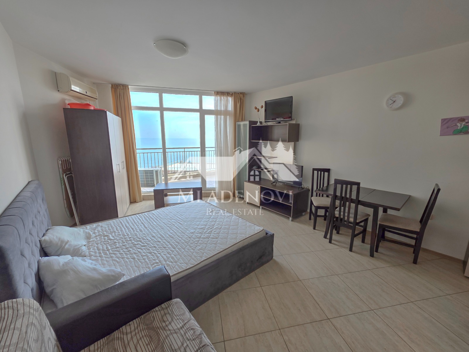 Предлагаме за продажба прекрасен едностаен апартамент с фронтална морска гледка в затворен комплекс в град Ахелой. Този изключителен имот предлага уют и комфорт в един от най-желаните комплекси на Черноморието, със съвременни удобства за пълноценна почивка. Комплексът разполага с два външни басейна, ресторант, воден бар, фитнес зала, козметичен салон със стая за масаж, рецепция, денонощна охрана и магазини. В допълнение, има изградена опесъчена плажна тераса, на която гостите на комплекса могат да се насладят на безплатни чадъри и шезлонги. Апартаментът е разположен на 6-ти, непоследен жилищен етаж с асансьор и се състои от просторно жилищно помещение с кухненски и спален кът, тераса, от която се открива невероятна морска гледка, баня с тоалетна и входно антре. Жилището е в добро състояние, готово за нанасяне, и предлага изключителна светлина и топлина. Комплексът е подходящ както за целогодишно ползване, така и за отдаване под наем. Таксата за поддръжка е 10,50 евро/кв.м с включено ДДС. Агенцията предлага пълно съдействие за финансиране на покупката чрез ипотечен кредит и безплатно юридическо обслужване през целия процес на сделката.