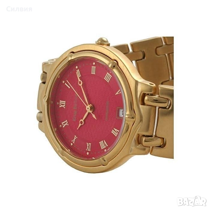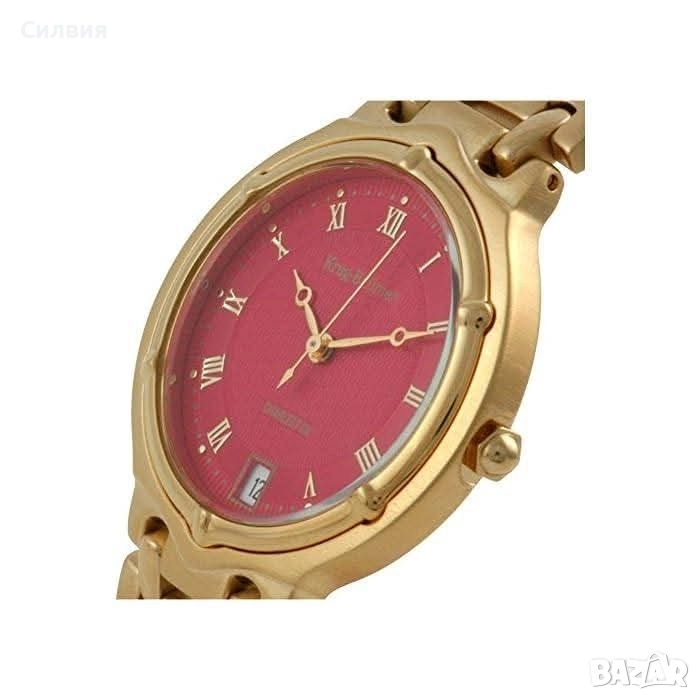 Дизайн: Златист цвят на корпуса и каишката, с червен циферблат.