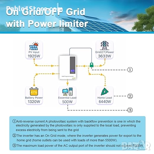 PMSUN MPPT 3.6kW 48V хибриден соларен инвертор - Максимален вход 500V PV - Изход AC220V с регулируемо зареждане и разреждане за намаляване на пиковите натоварвания и запълване на долини Спонтанно самопотребление: Слънчевата енергия дава приоритет на мощността на зареждане, докато излишното електричество зарежда батерията. Ако мощността на слънчевия панел е ниска, AC байпасът се извършва (при високи сметки за електроенергия, напрежението за изключване на AC зареждането на батерията може да бъде намалено, за да се избегне зареждането на батерията по време на пикови часове на ток).
