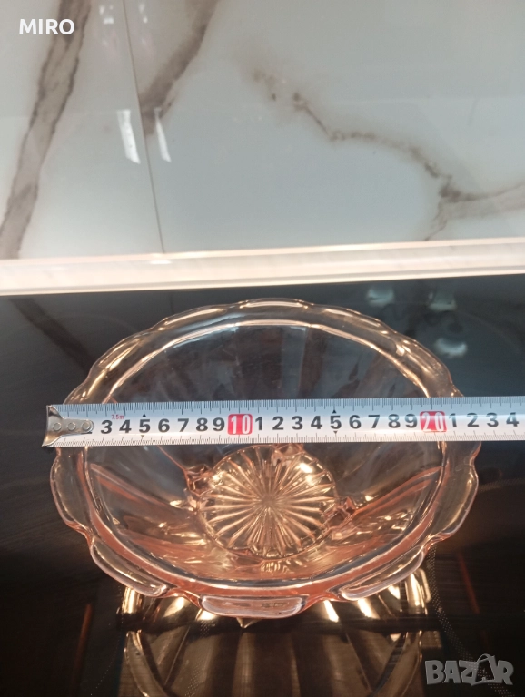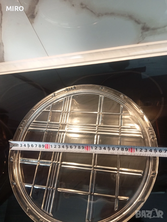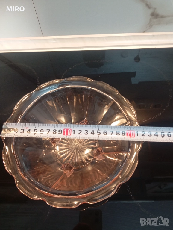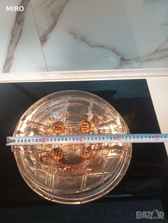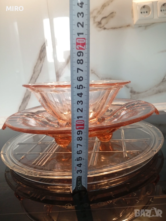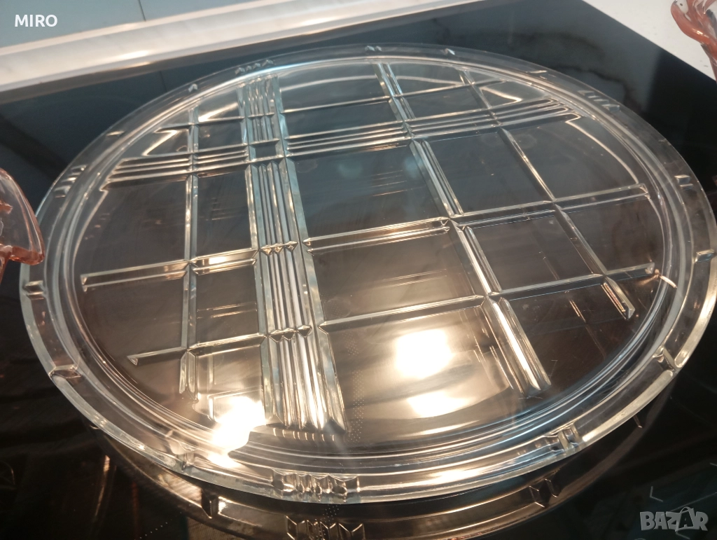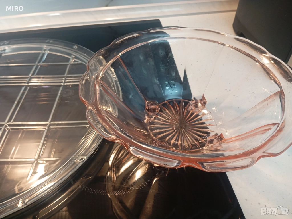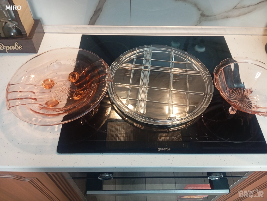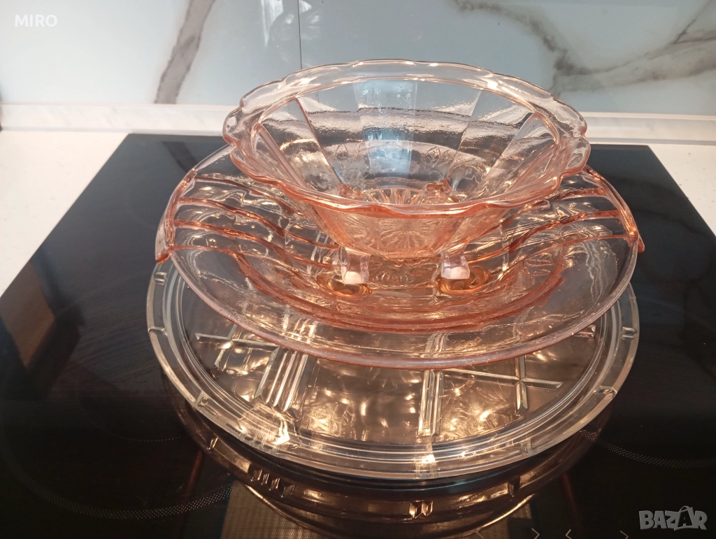 Стъклен комплект от три части - плато, поднос и купа. Без забележки
