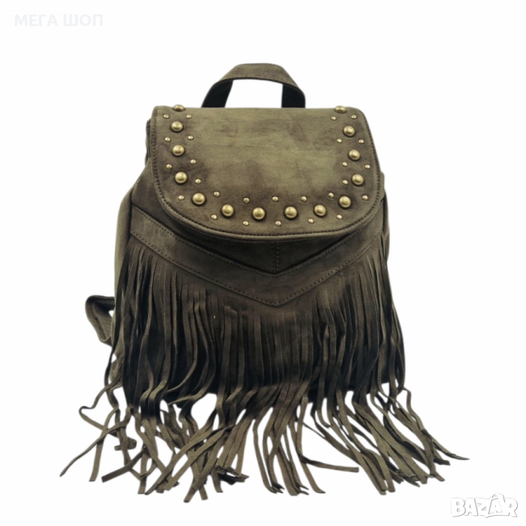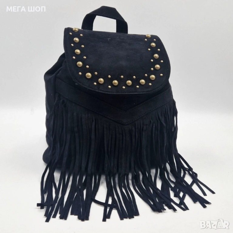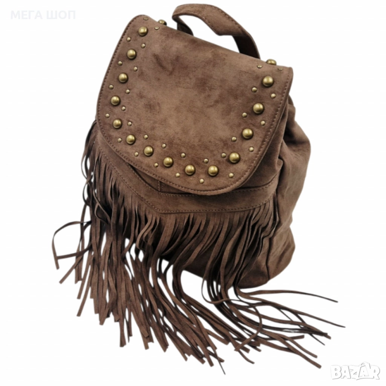 Велурена дамска раница с ресни и метални нитове – бохо стил и практичност → Обява 52643500