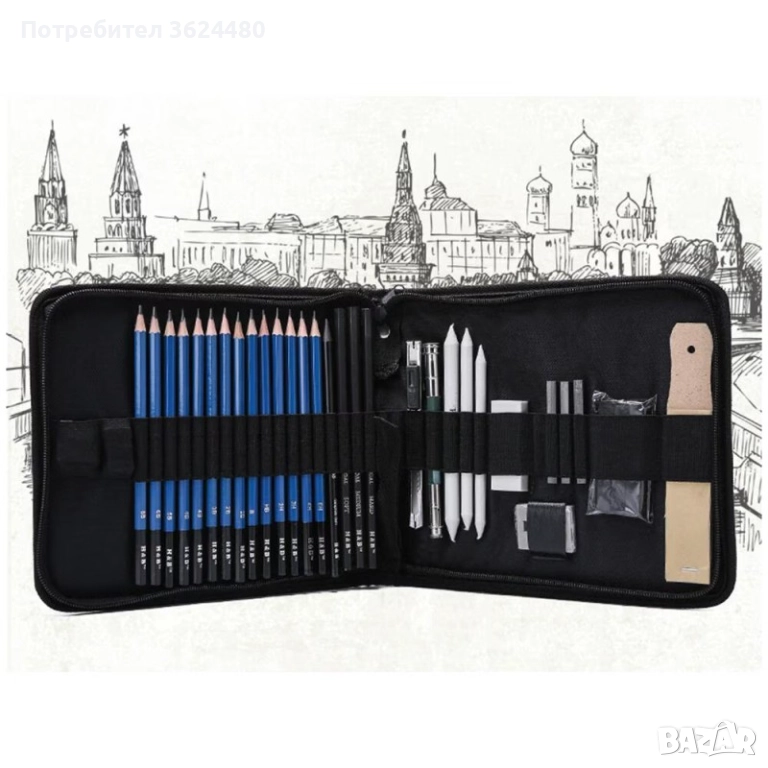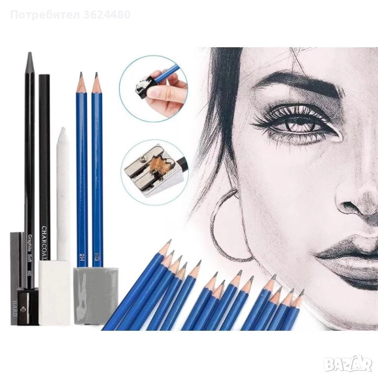 Моливи за скициране: 12 бр. графитни моливи (от 5H до 8B) и 3 бр. въглени моливи за контраст.