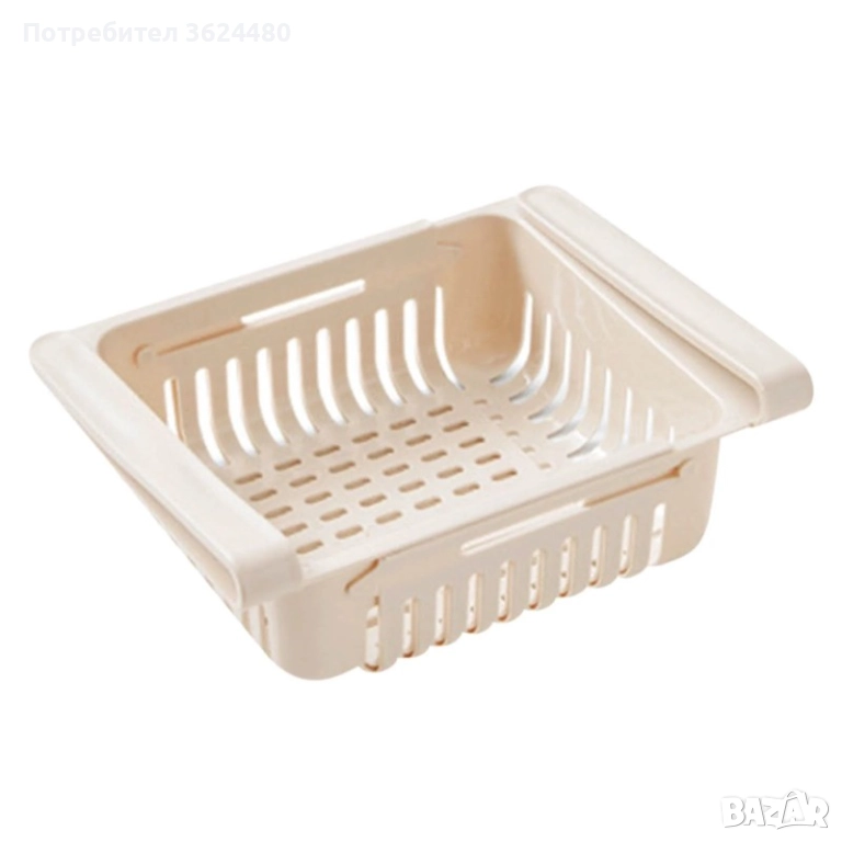 Оптимизирайте пространството във вашия хладилник с този иновативен разтегателен органайзер чекмедже. Този аксесоар се монтира лесно под всеки хладилен рафт с помощта на клипс система за закрепване, което създава допълнително място за съхранение. Неговият разтегателен механизъм позволява дължината му да бъде регулирана от около 20 см до 28.5 см, адаптирайки се към вашите нужди. Изработен е от издръжлива пластмаса и има перфориран дизайн с вентилационни отвори за поддържане на свежестта на храната.