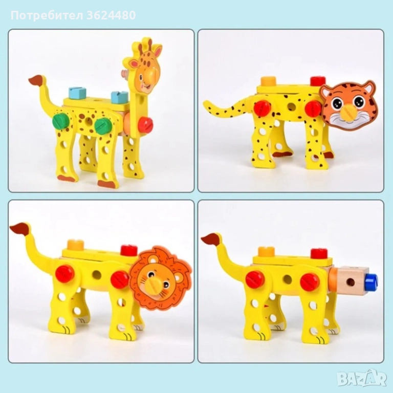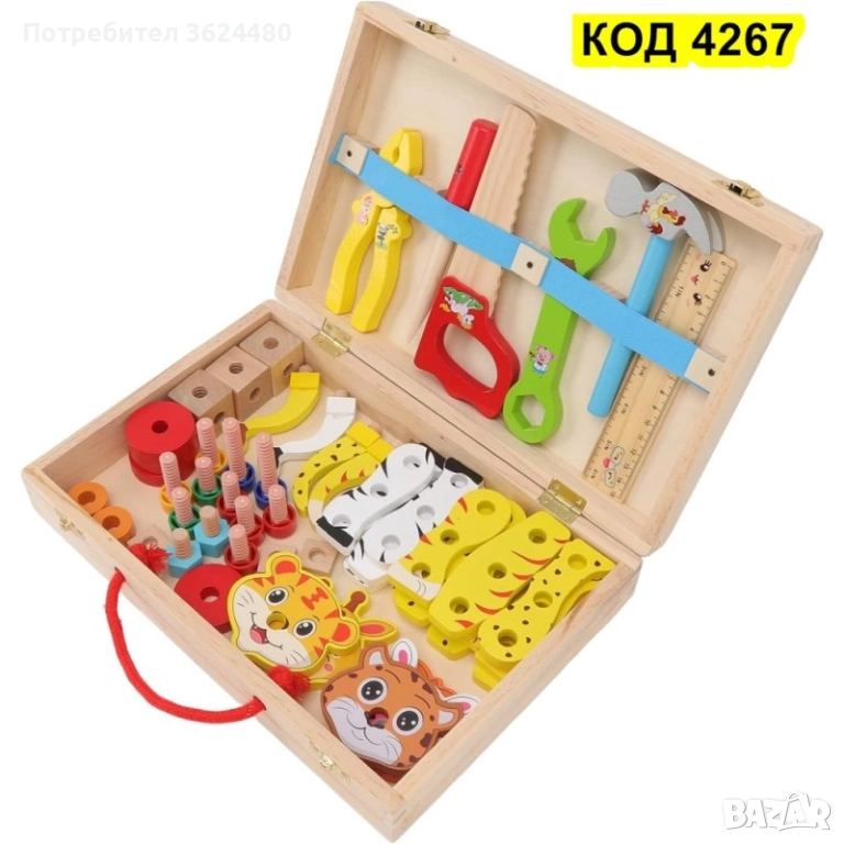 Детски дървен куфар с инструменти и животни за сглобяване